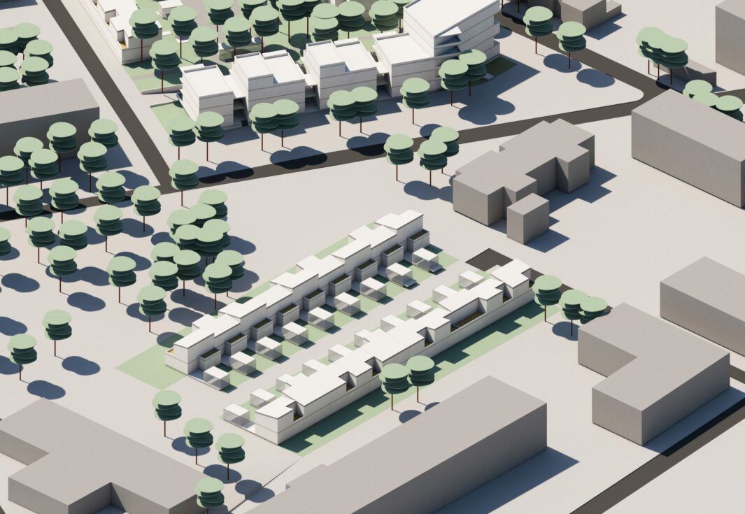 Pour ce faire, nous avons choisi la typologie de l’habitat intermédiaire, créant des volumes fragmentés, reliés par des passerelles extérieures de distribution, rappelant l’échelle des petits immeubles.