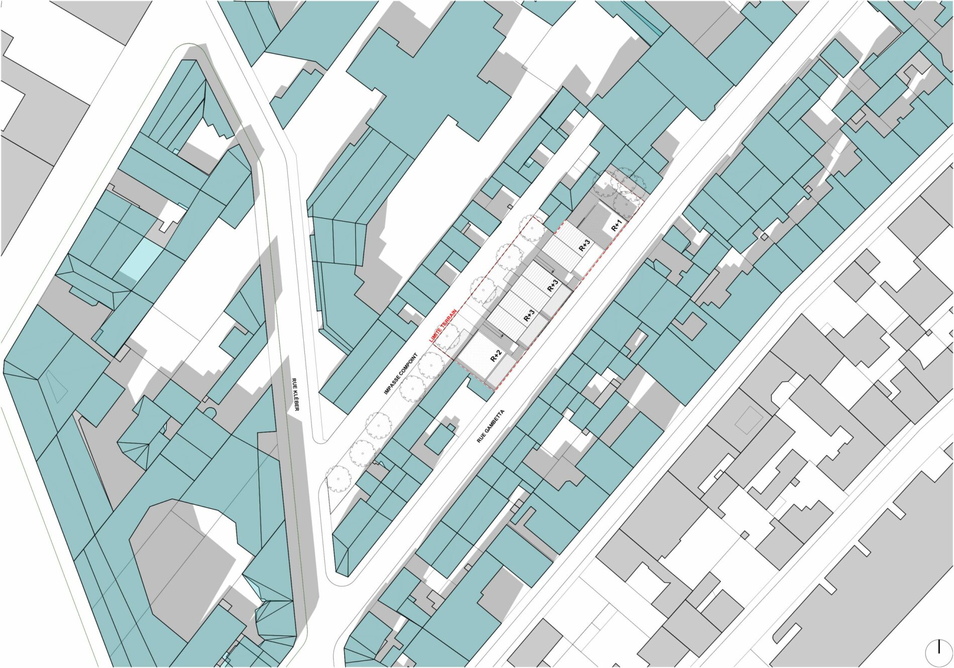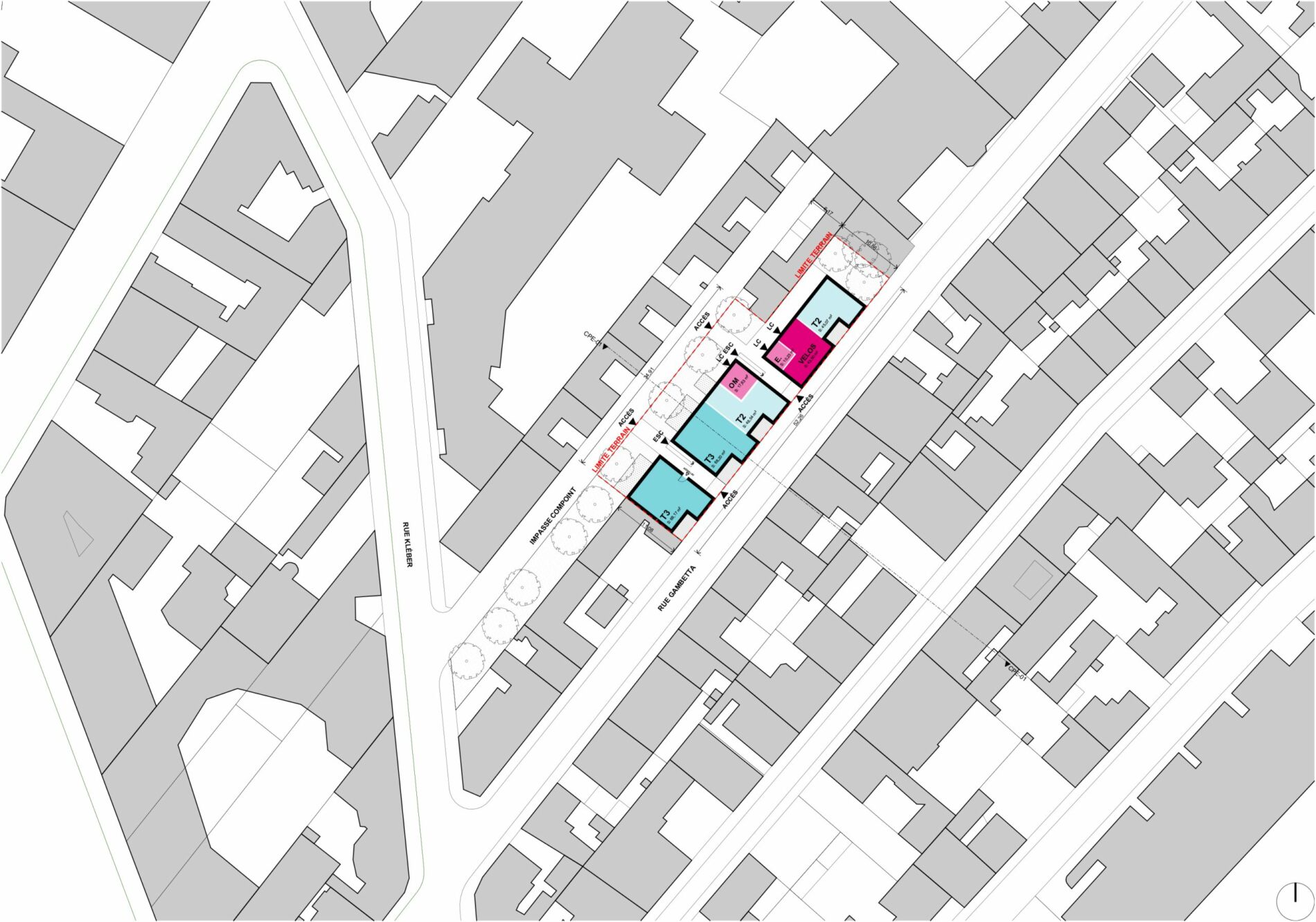 Sur un terrain complexe, occupé par de petits immeubles de faubourgs dégradés et voués à être démolis, pris entre la rue Gambetta au Sud et l’Impasse Compoint, l’agence ANYOJI BELTRANDO Architectes-Urbanistes a réalisé, dans le cadre du PRIR ROSIER-DEBAIN, une fiche de lot définissant les axes de réflexion présidant à la réalisation de l’étude de faisabilité.
