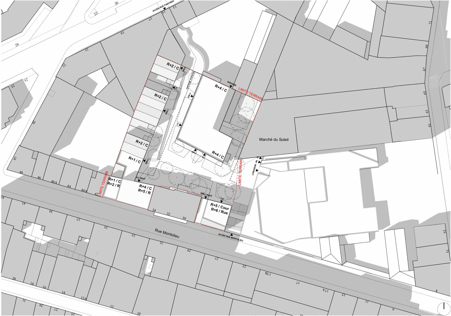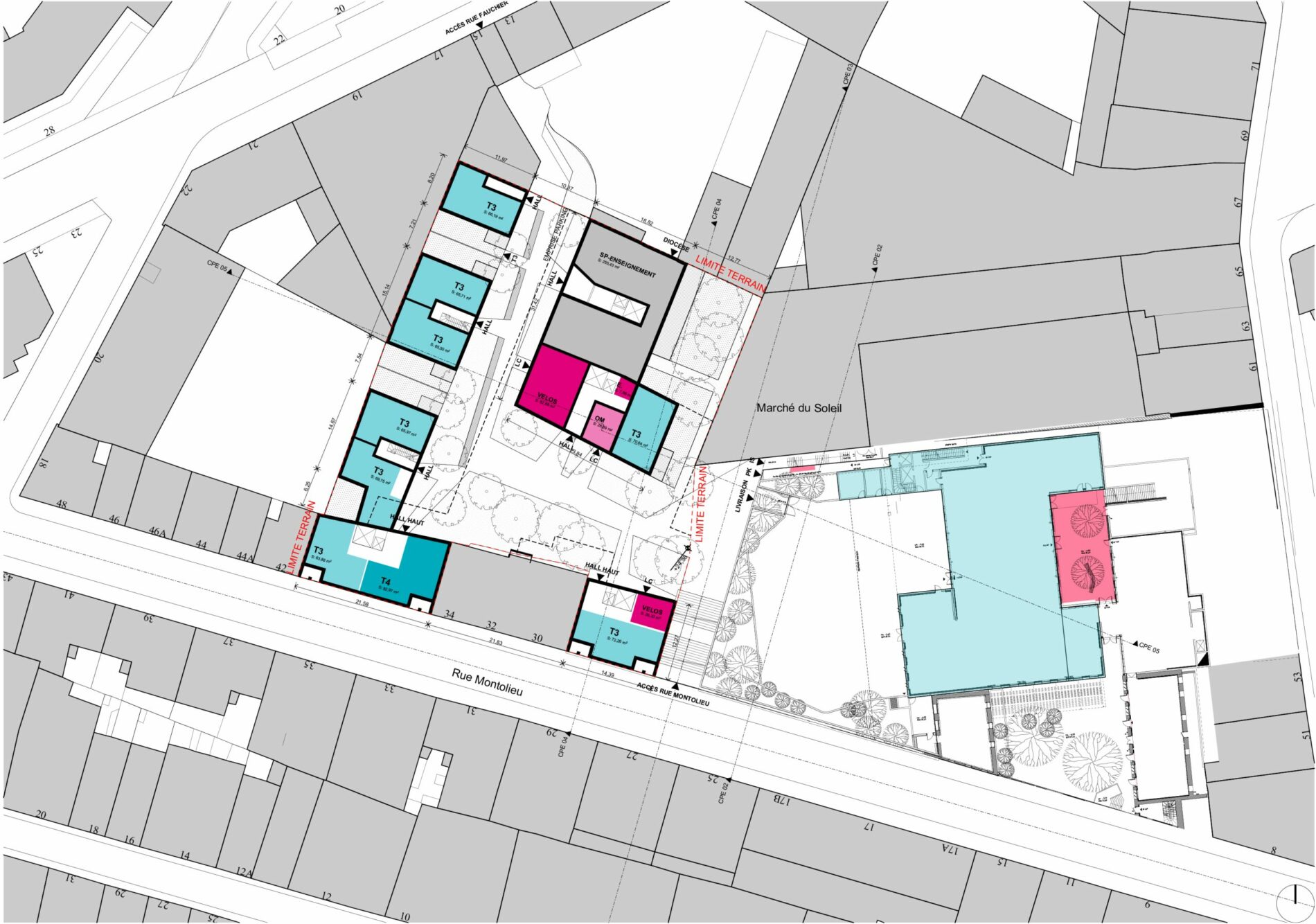 Sur une vaste emprise foncière au cœur du quartier du Panier, occupée par des bâtiments à usage d’activité, non conservés, et en limite du marché du Soleil ainsi que du groupe scolaire Montolieu, le projet s’insère dans un tissu dense et complexe.