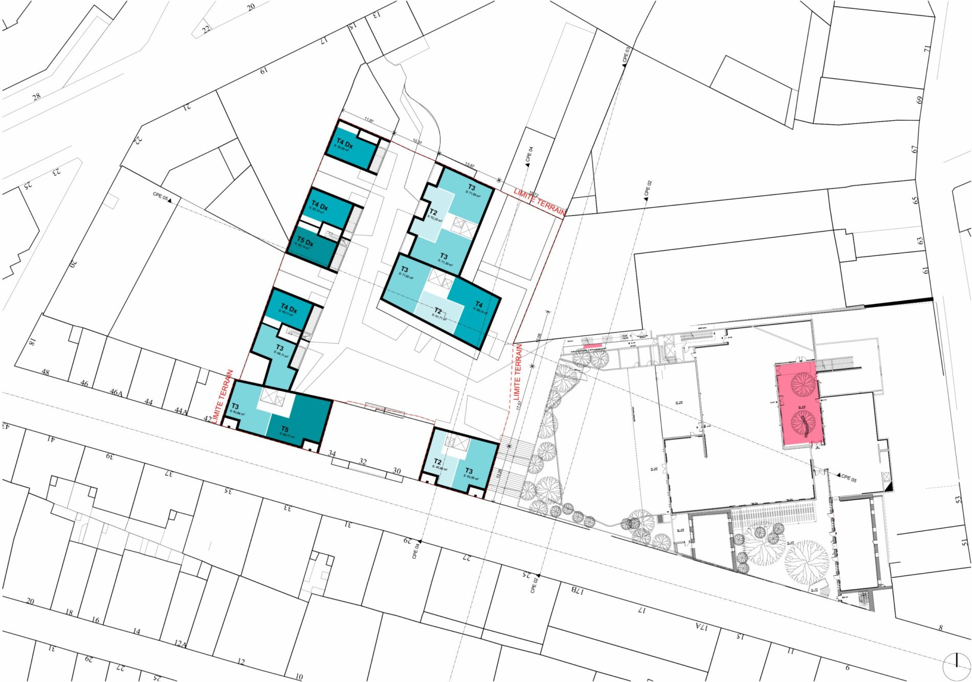 Pour pouvoir bâtir ce terrain, il a fallu créer une voie interne, sur une emprise dont le dénivelé, entre la rue Fauchier au Nord et la Rue Montolieu au sud, est d’environ 5 mètres. L’accès principale se fait donc par la rue Fauchier au nord, tandis qu’un escalier monumental au sud permet un second accès piéton ainsi qu’une ouverture plus marquée sur le cœur de l’îlot.