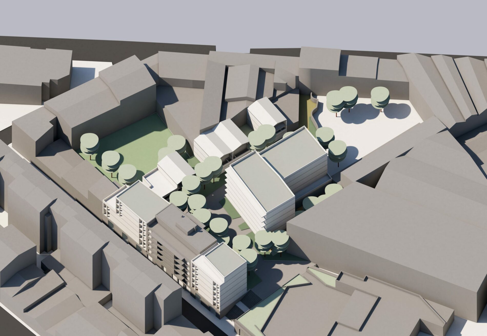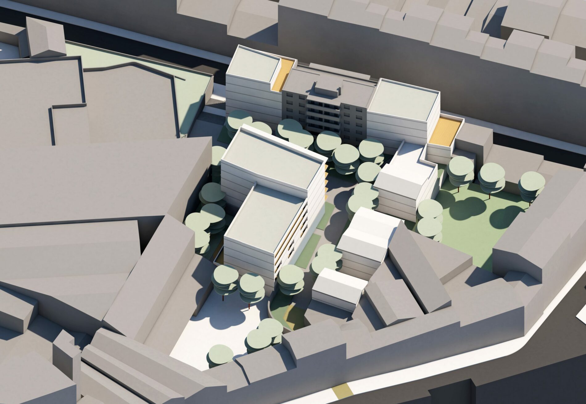 Sur ces bâtiments en rez-de-chaussée, accueillant l’accès au parc de stationnement enterré, un local d’activité, les locaux communs et les circulations verticales, deux immeubles, respectant le gabarit de l’immeuble existant contre lesquels il s’adosse, sont prévus