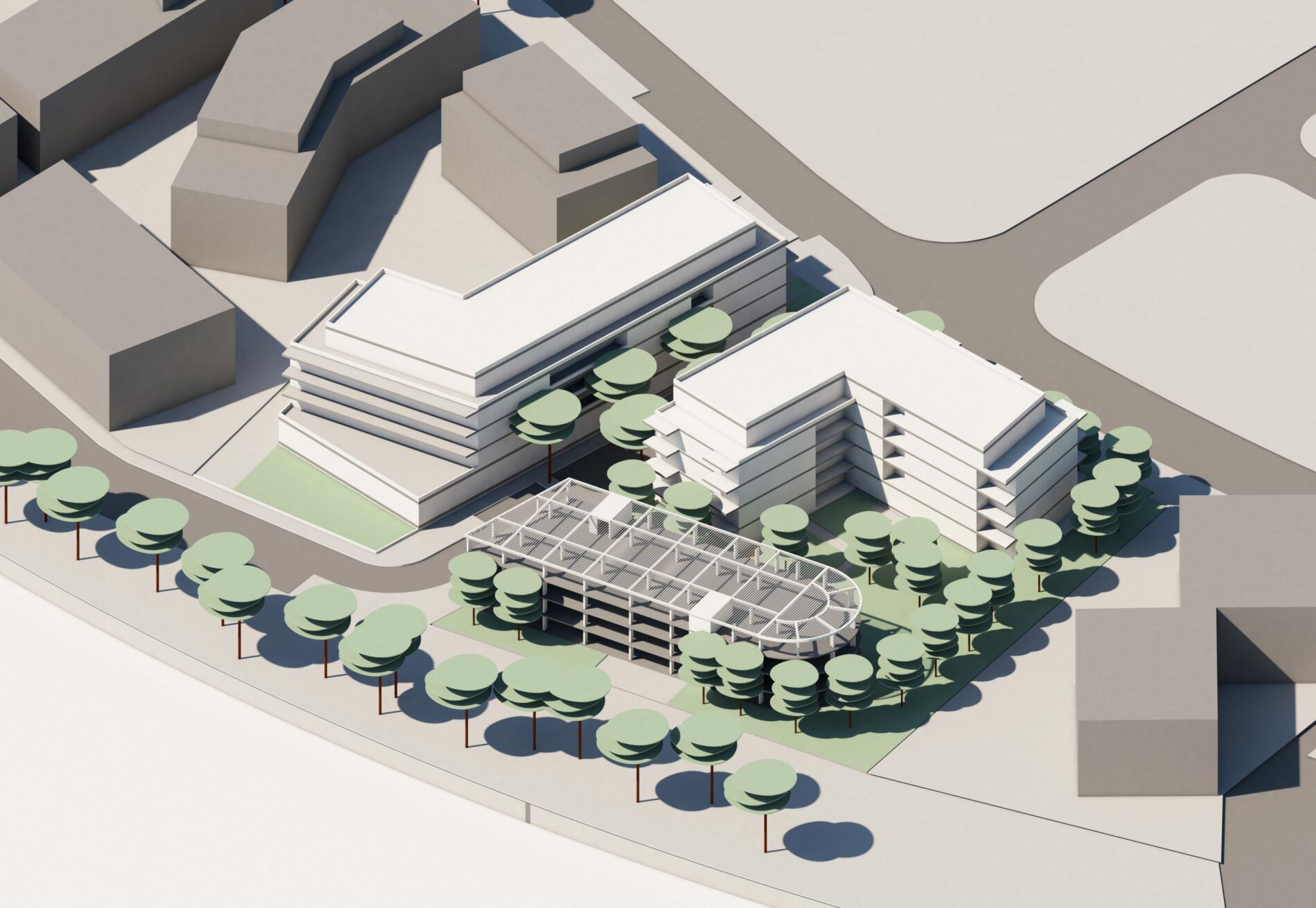 Le stationnement est géré sous le bâtiment de l’îlot nord tandis qu’un parking silo, en limite ouest de l’îlot sud accueille les places de stationnement de ce bâtiment faisant écran aux nuisances de l’autoroute A51.