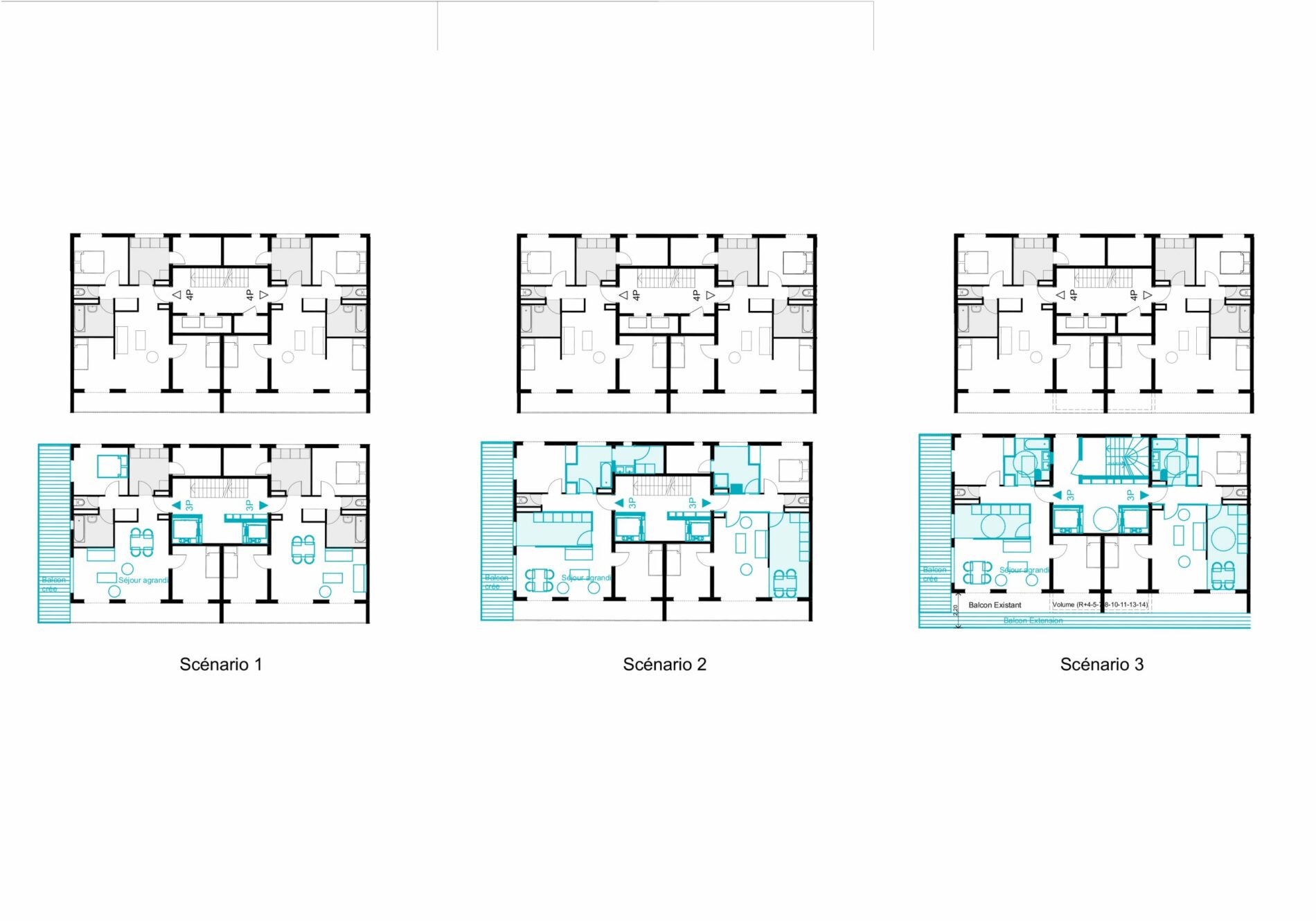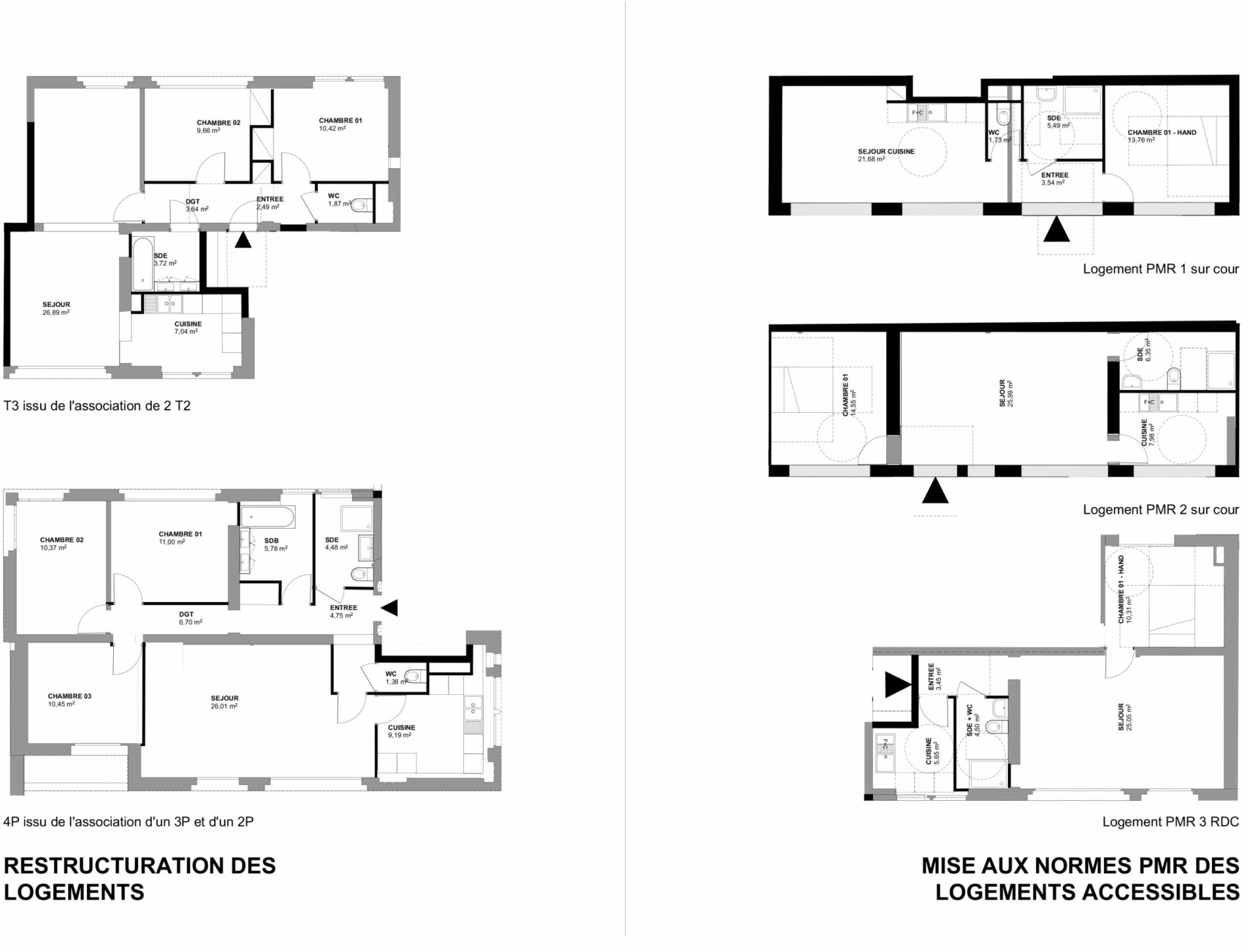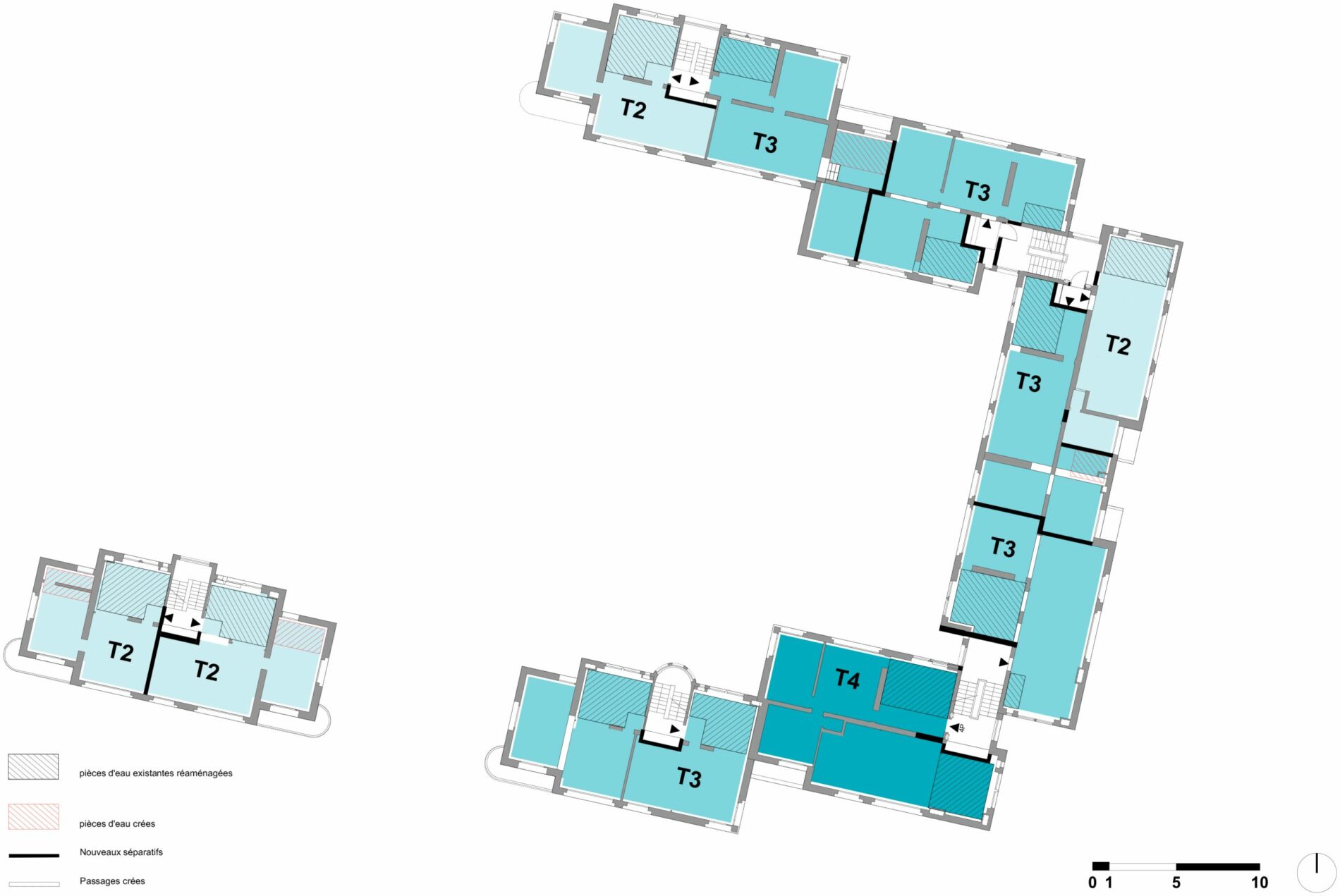 Tout l’enjeu de cette étude a été de proposer une restructuration intérieure des logements par association de typologies tout en s’appuyant et respectant toutes les qualités de conception intérieure, ainsi que la structure et les façades de cet ensemble de bâtiments, classés site patrimonial remarquable.