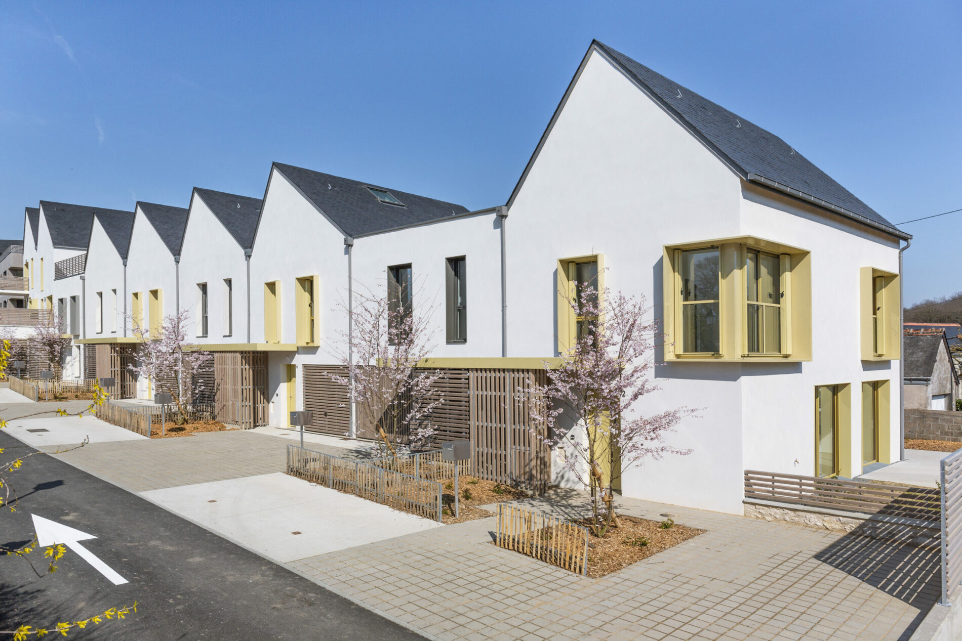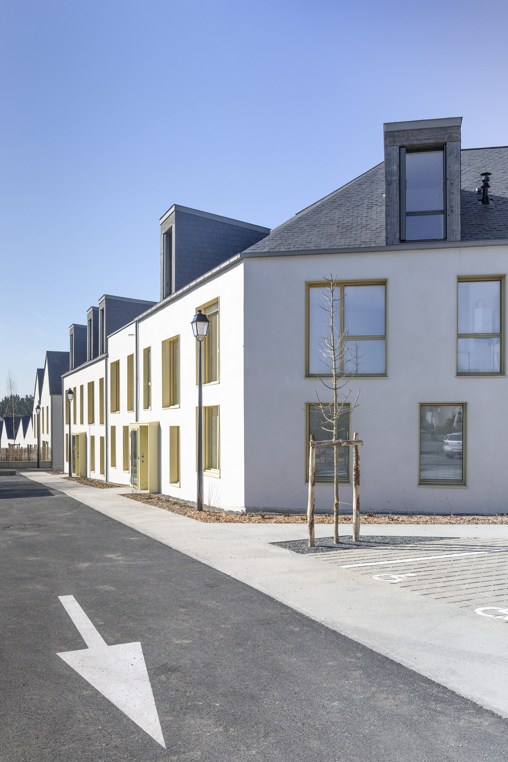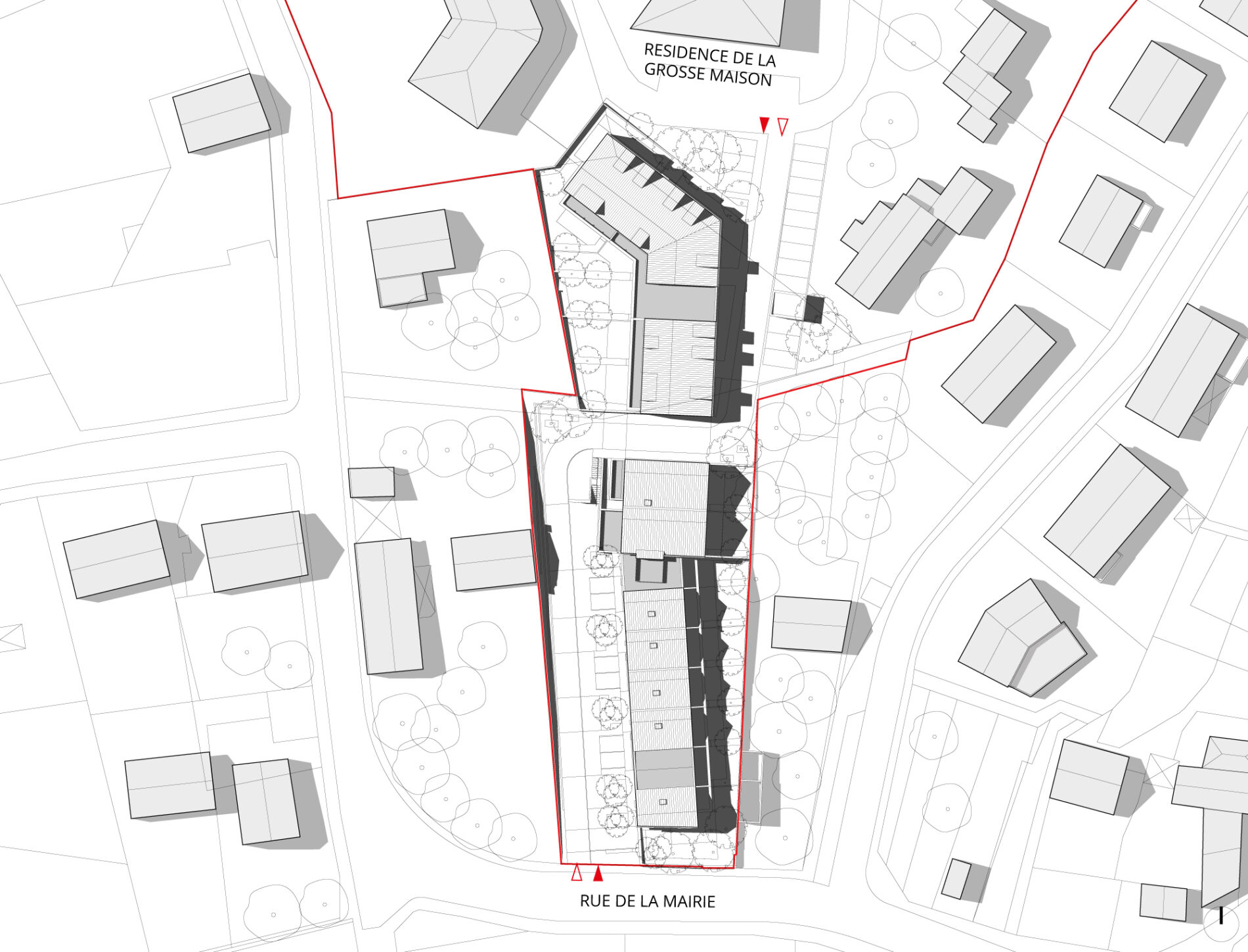 A la lumière des qualités géographiques et paysagères du site, les constructions sont disposées dans le sens nord-sud, parallèlement au site et le long d’une voie de distribution en sens unique liant la rue de la Mairie à une résidence existante. Le projet est ainsi connecté au tissu viaire existant, évitant ainsi l’effet de lotissement, et permettant une sortie vers un réseau moins passant.