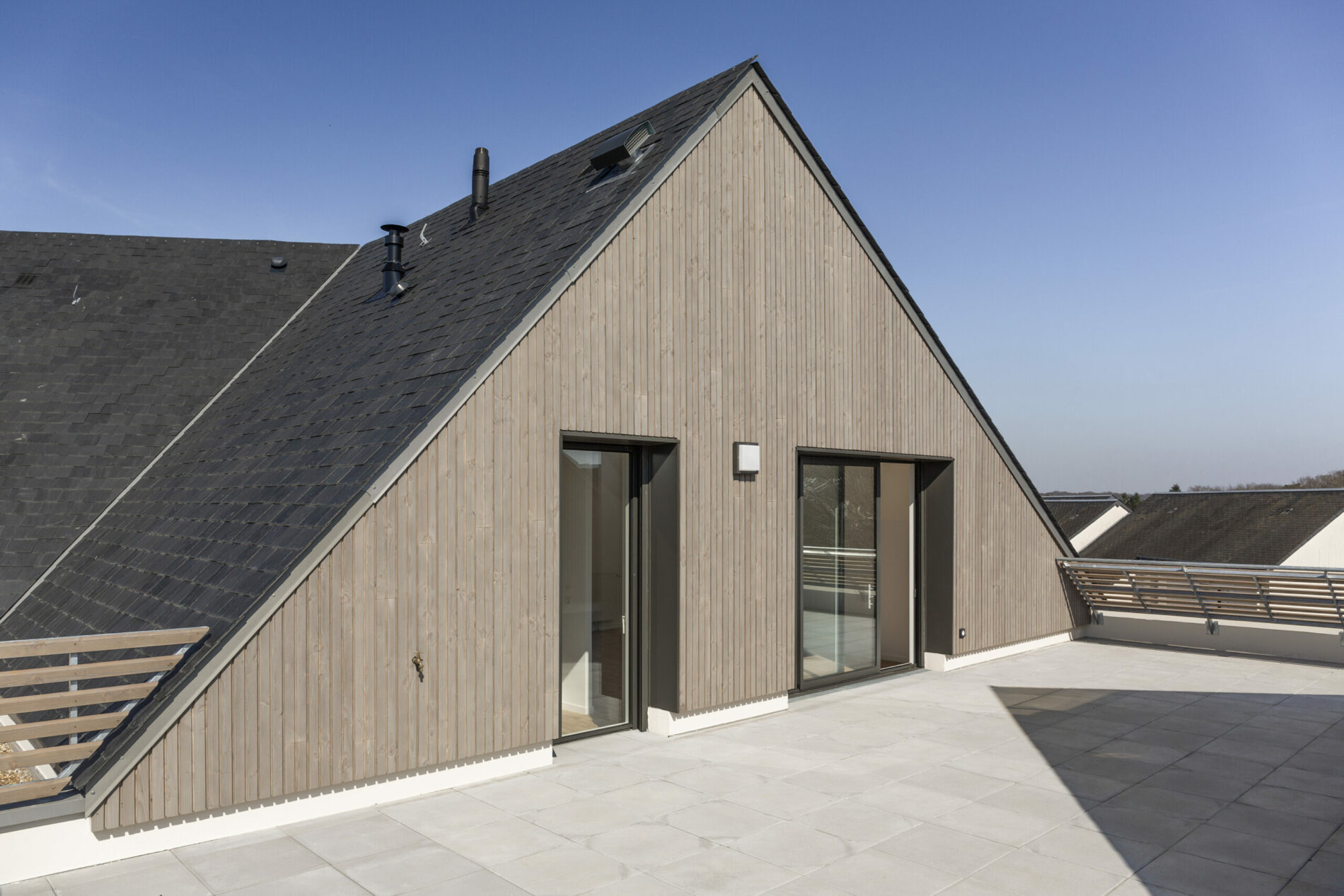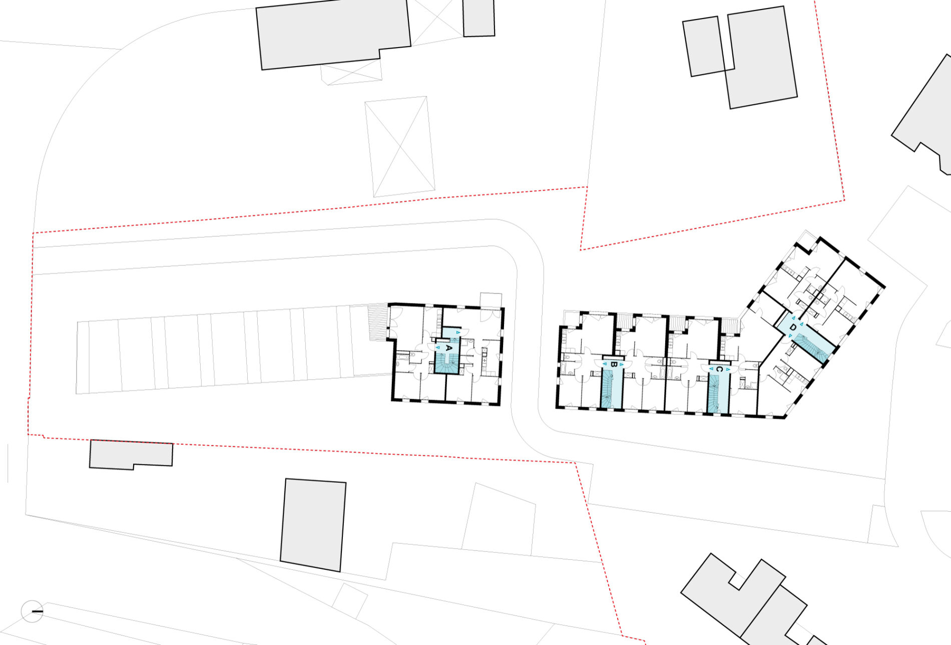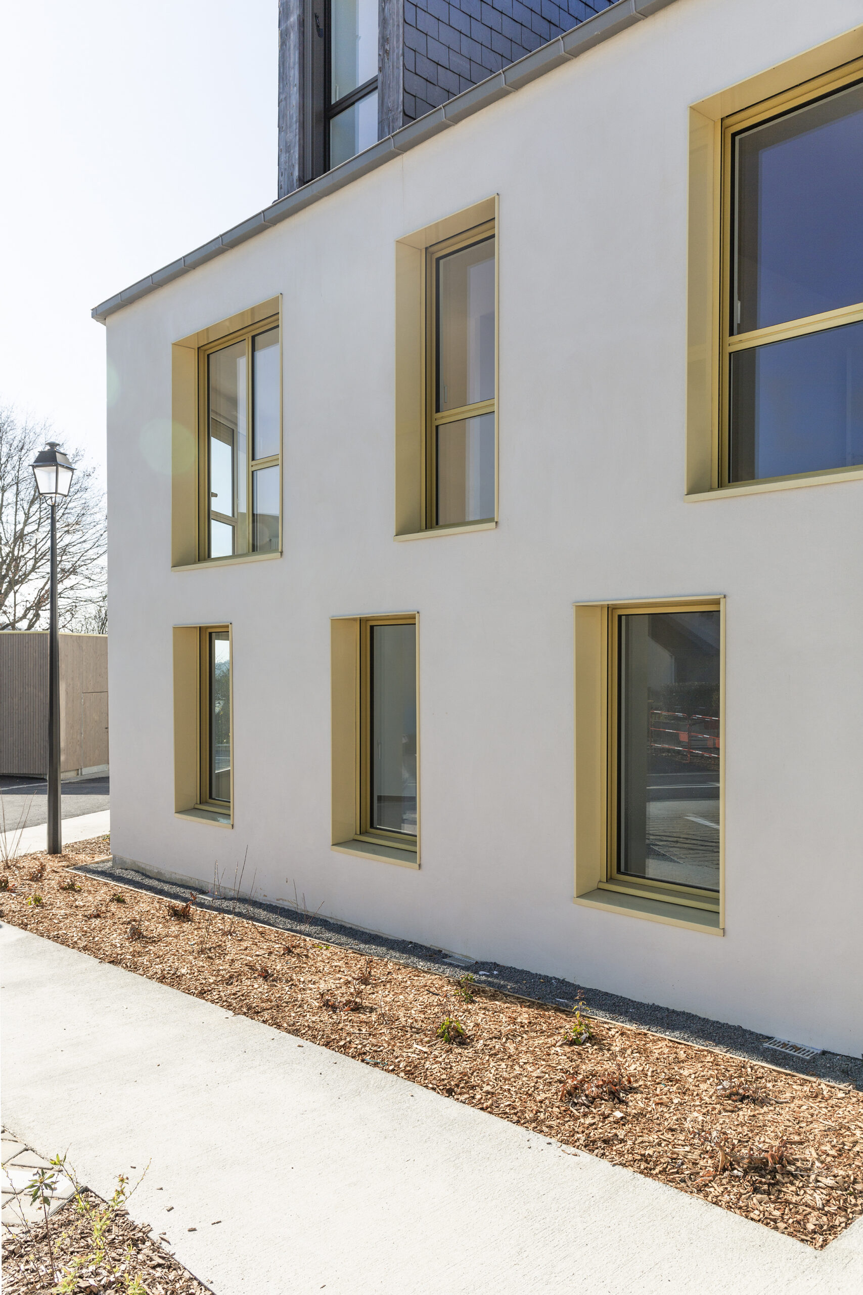 Un premier ensemble de maisons en bande est disposé au sud du terrain, reprenant le gabarit des maisons alentours et permettant à la nouvelle construction de se fondre dans un paysage construit relativement bas et aéré dans un environnement naturel fortement végétalisé. Au nord du terrain, un bâtiment de logements collectifs en forme de L ouvert, conforte et prolonge l’ensemble déjà existant, propriété du même Maître d’Ouvrage.