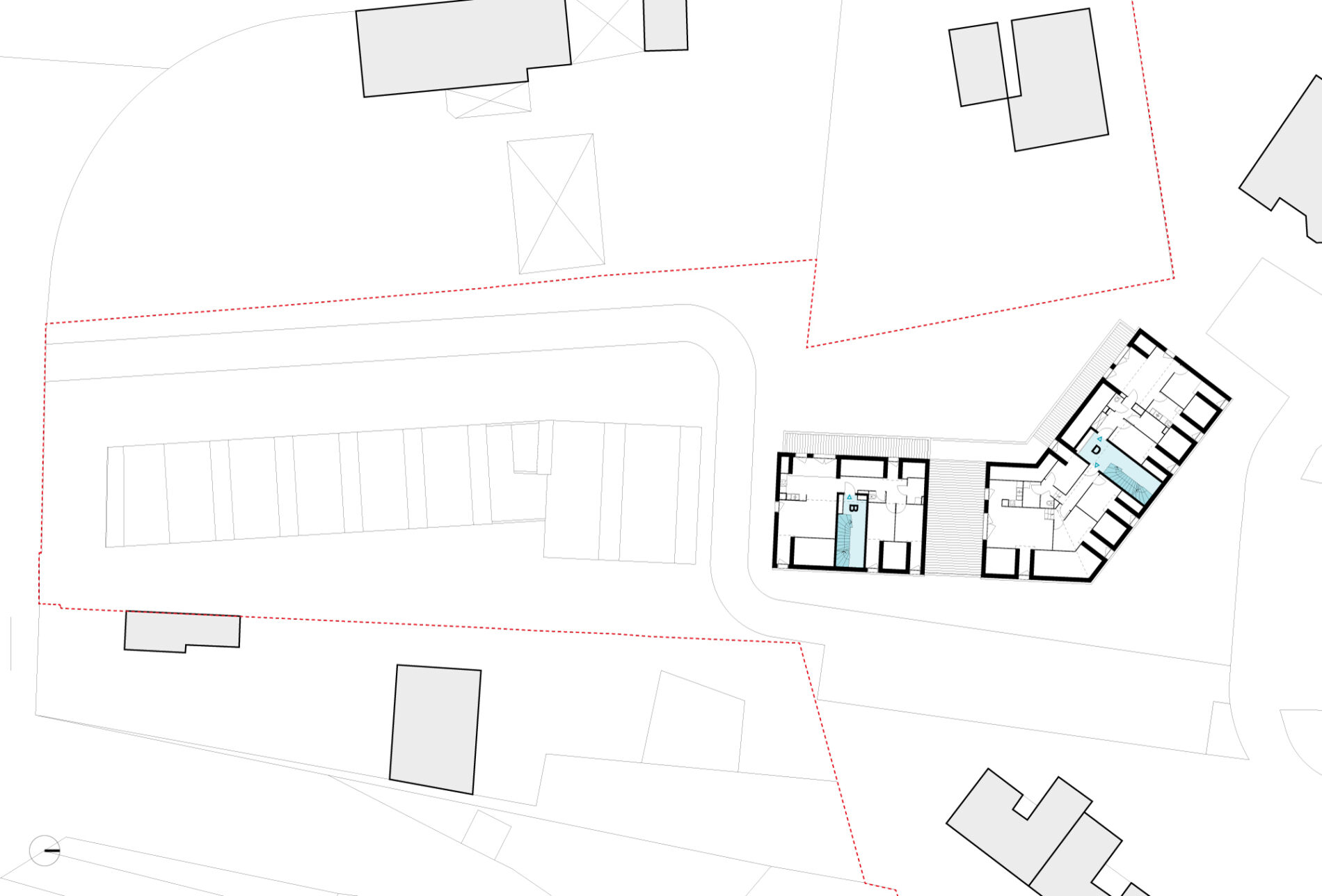 Enfin, le projet tire parti de la différence de niveau entre les parties hautes et basses du site, séparées par un haut mur de soutènement déjà présent, pour y loger les places de stationnement des logements collectifs, à l’intérieur d’un parking semi enterré et naturellement éclairé.