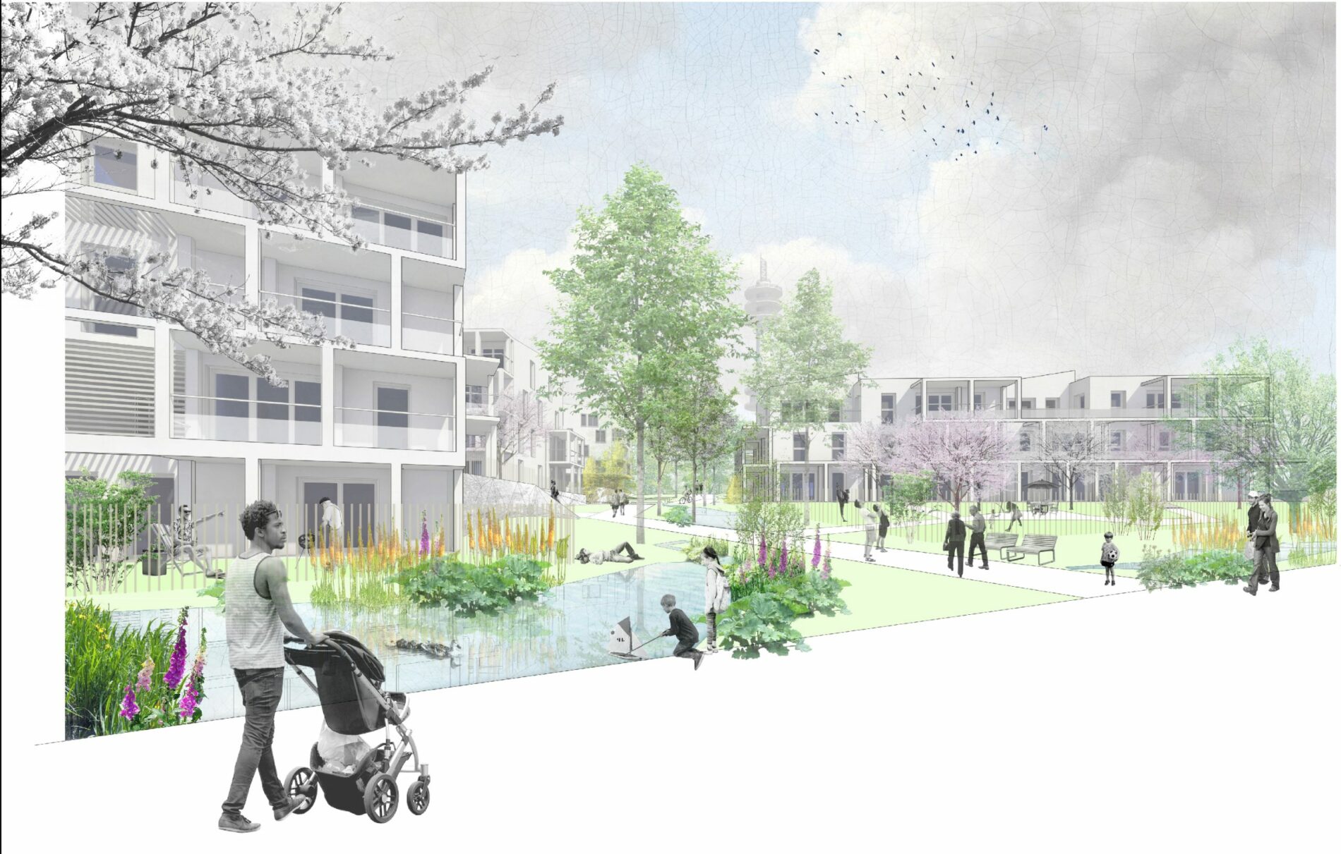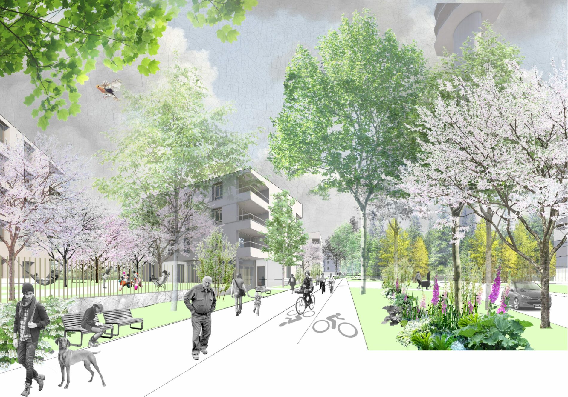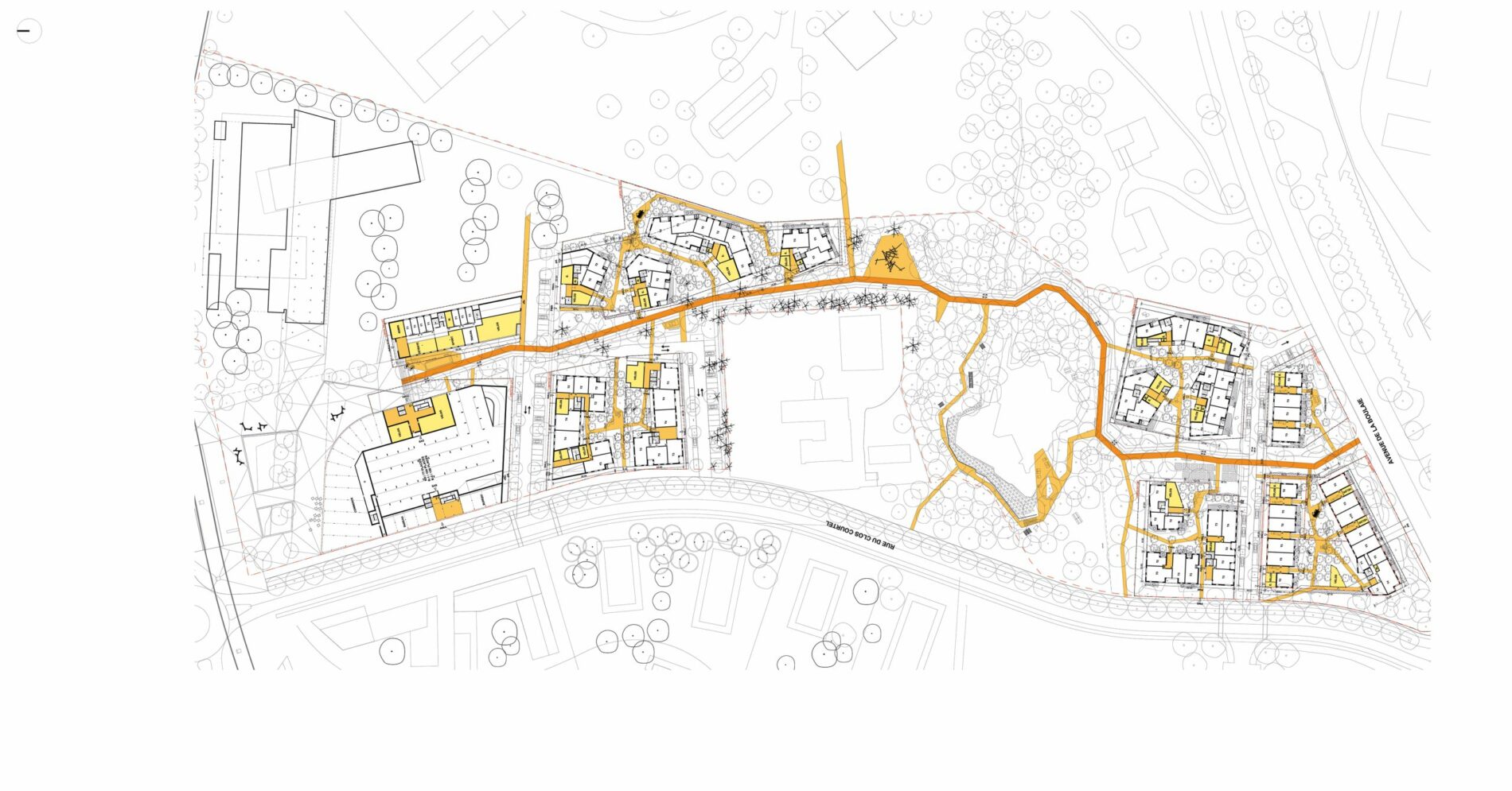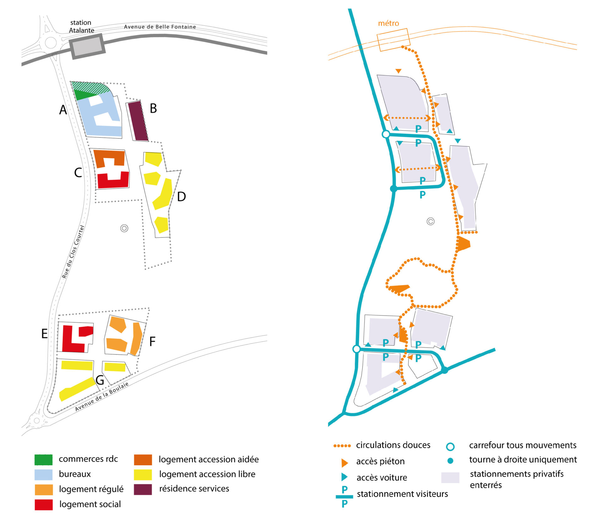 L’ensemble des programmes de logements y trouvent leurs entrées, et les espaces libres accueillent des fonctions et aménités qui contribuent à cristalliser la vie du quartier.