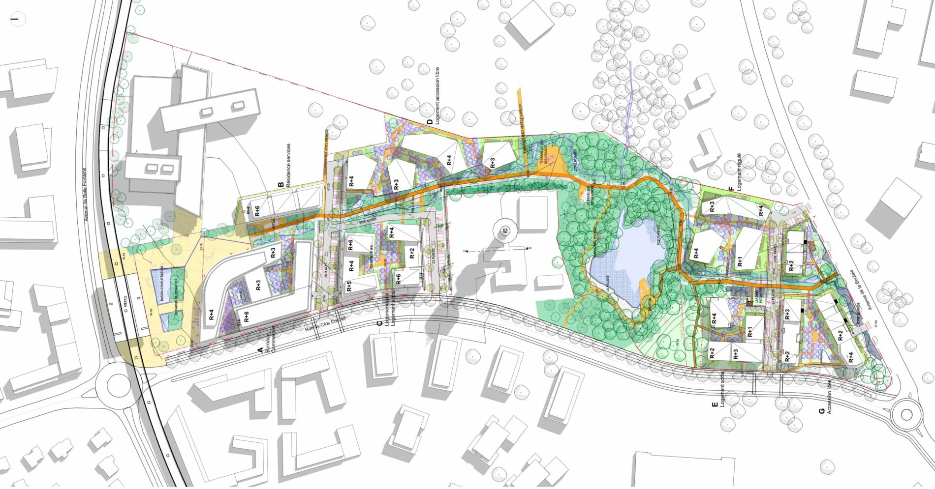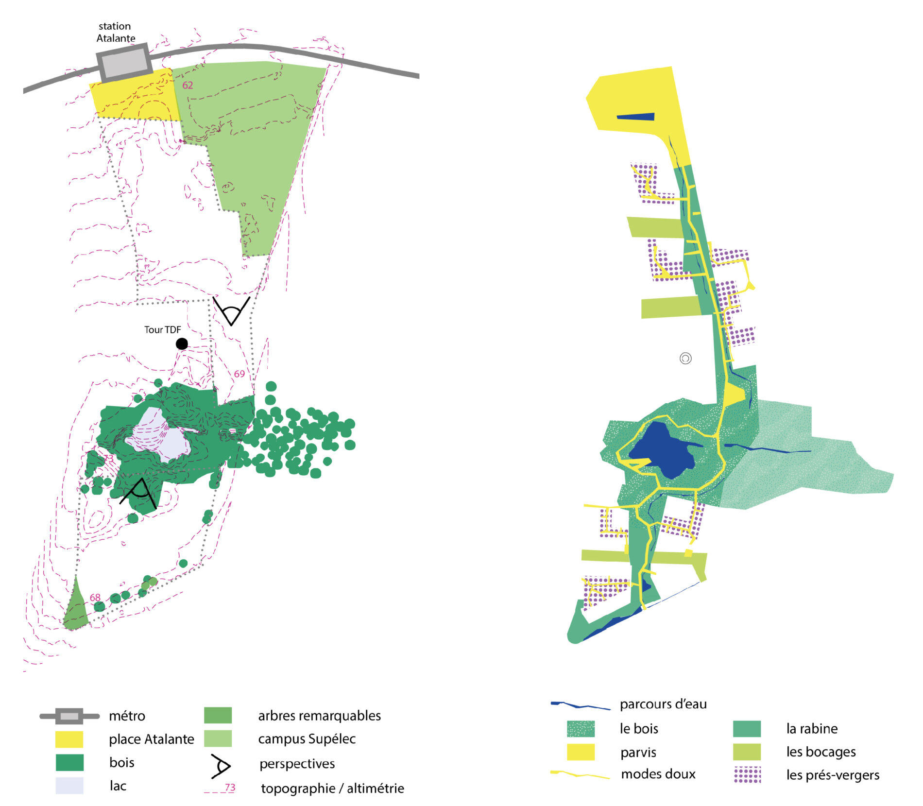 Pour compléter celle du bois existant, le projet installe trois nouvelles figures paysagères inscrites dans la tradition Cessonnaise des chemins de traverse qui irriguent l’ensemble de la ville. et forme la structure du projet: la rabine, les bocages et les pré vergers, ainsi que le jardin linéaire.