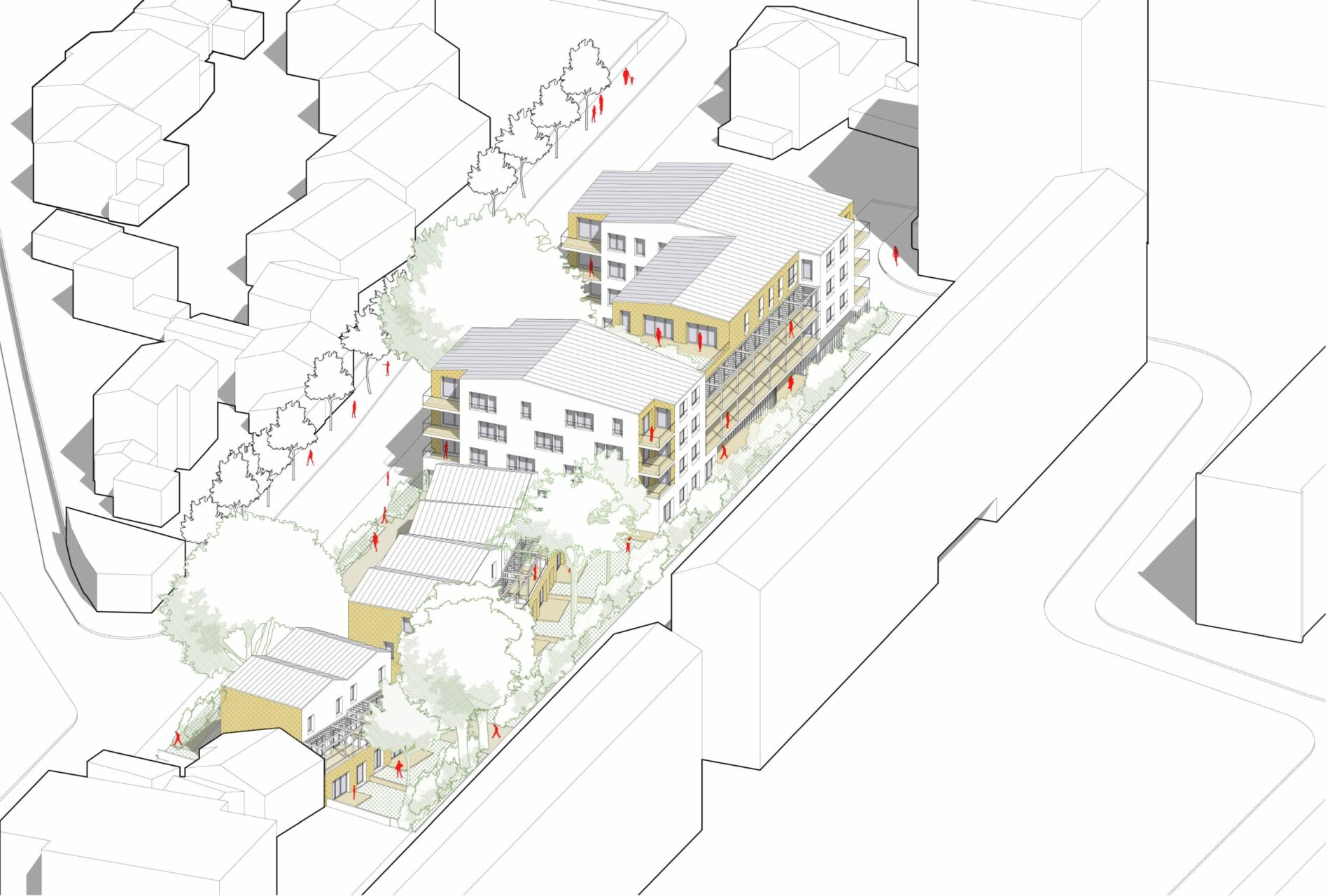 Sur un terrain en plateaux, occupé par un square, deux maisons individuelles et des box de stationnement, le projet ambitionne de faire la couture entre un habitat pavillonnaire et la résidence du Morillon, habitat collectif des années 60