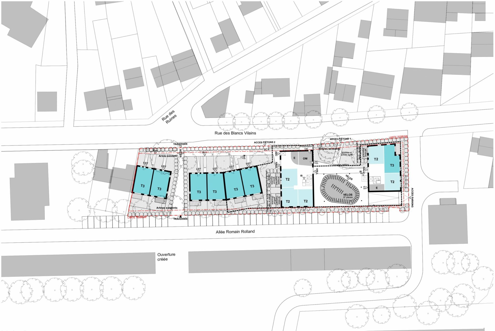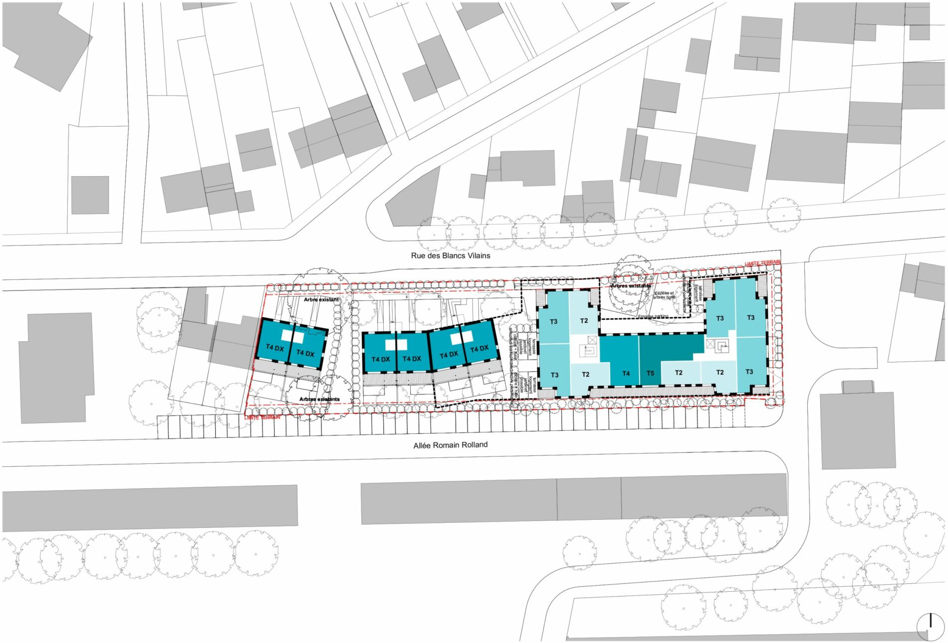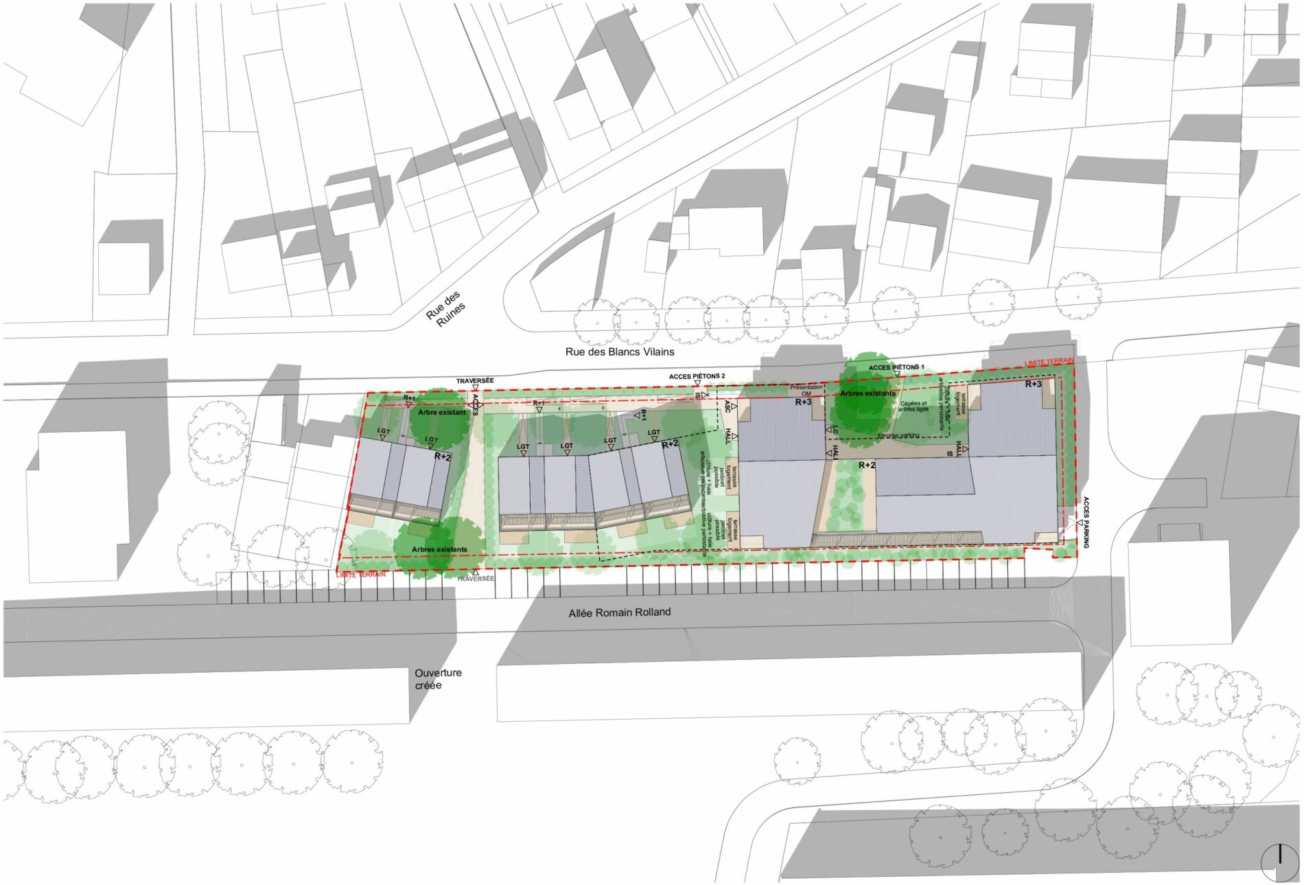 > le bâtiment de logements collectifs s’implante et entoure tel un écrin les trois frênes regroupés le long de la rue des Blancs-Vilains.