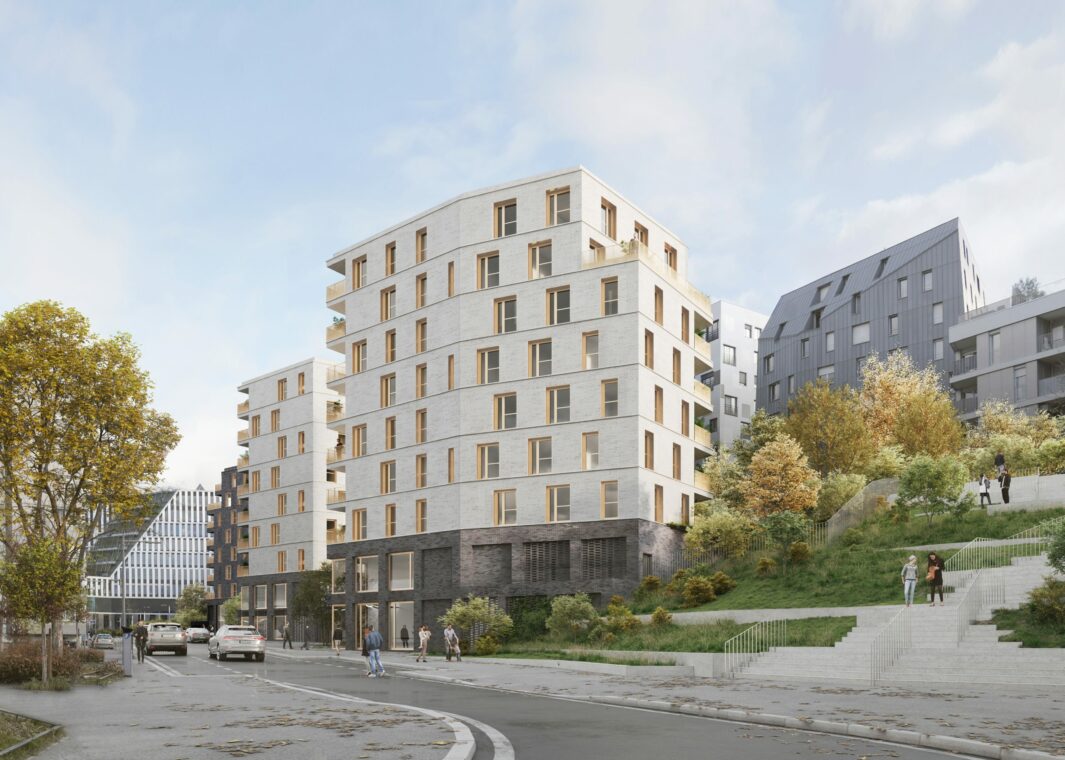 Enfin, la dynamique d’implantation, de fractionnement des volumes et des matières permet de limiter l’impression de densité de l’opération et prend le contrepoint du Morillon, constructions d’après-guerre linéaires et sans reliefs.