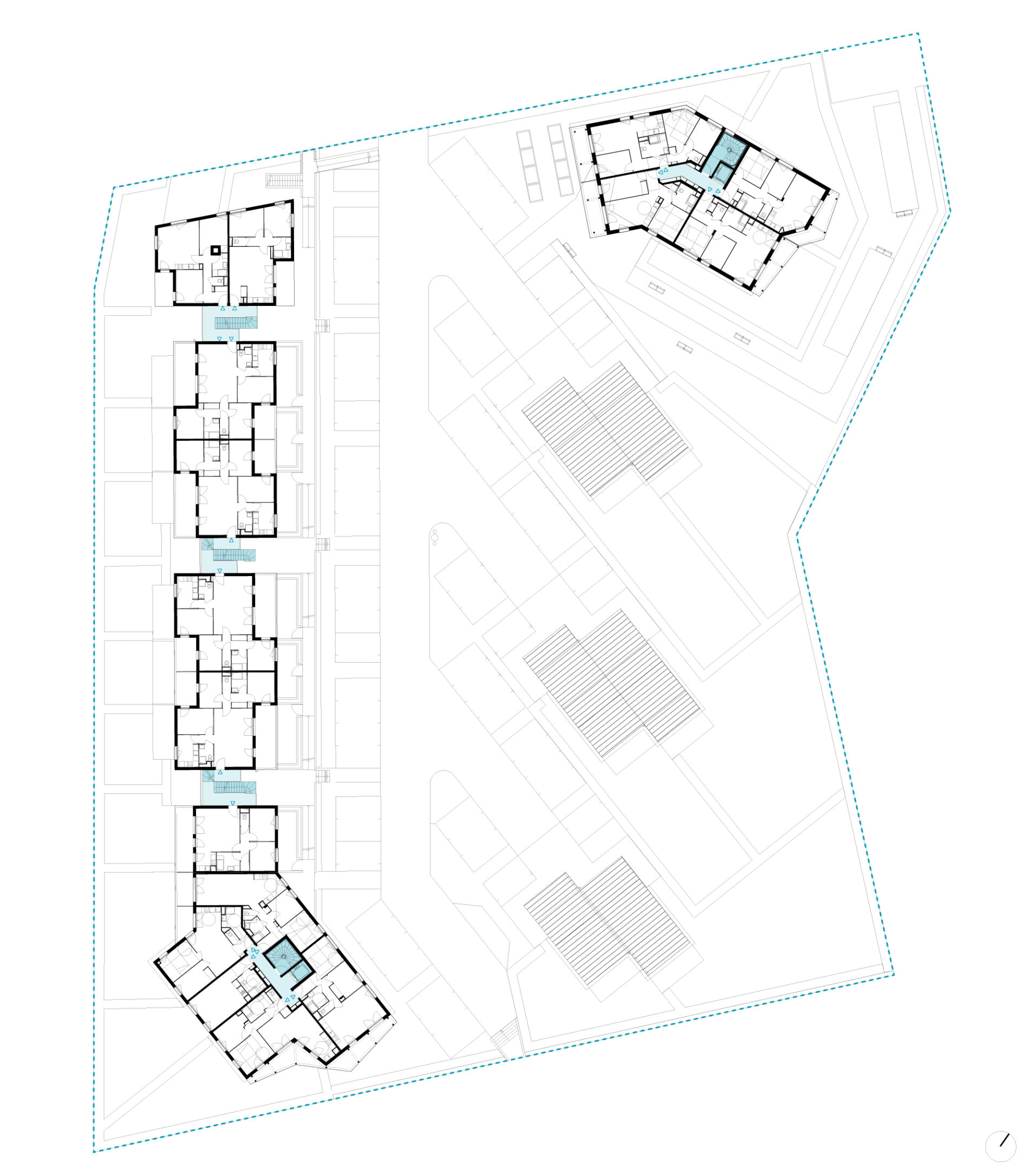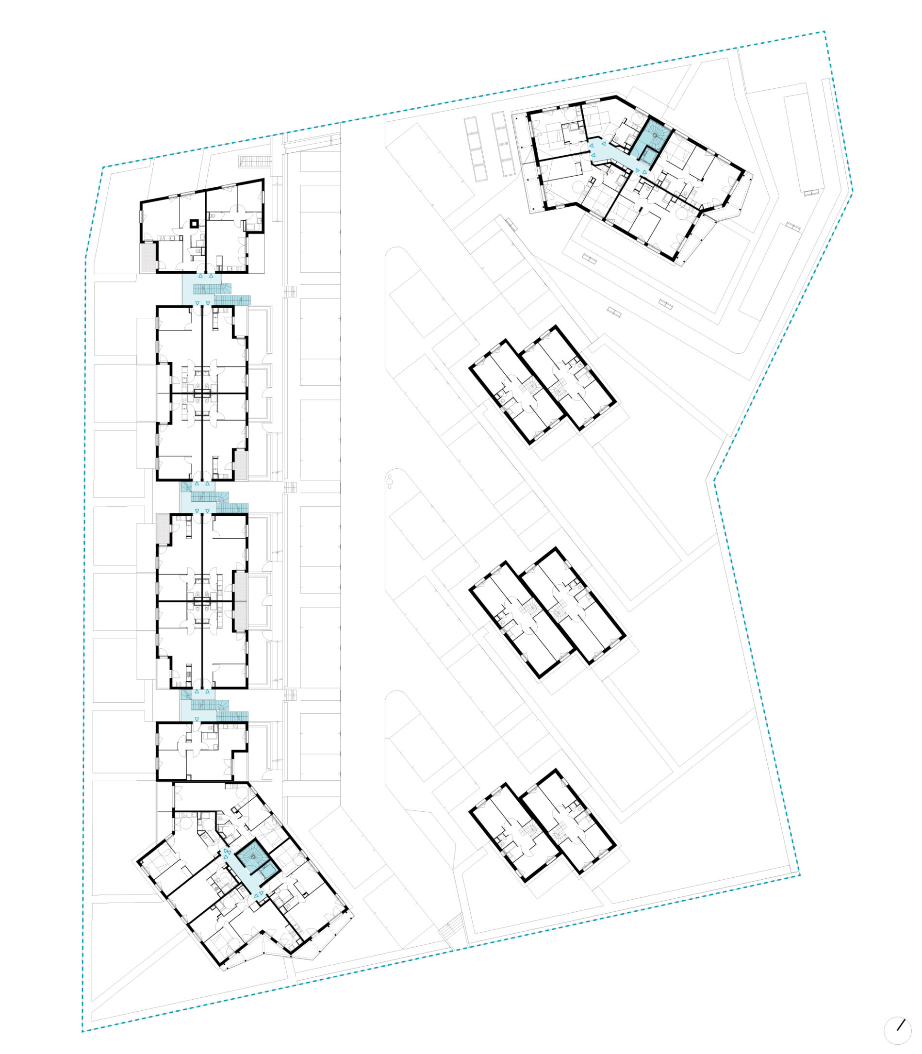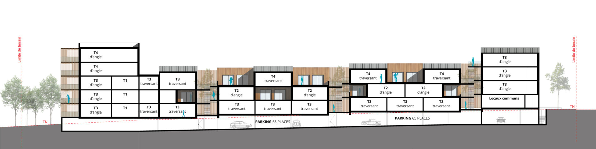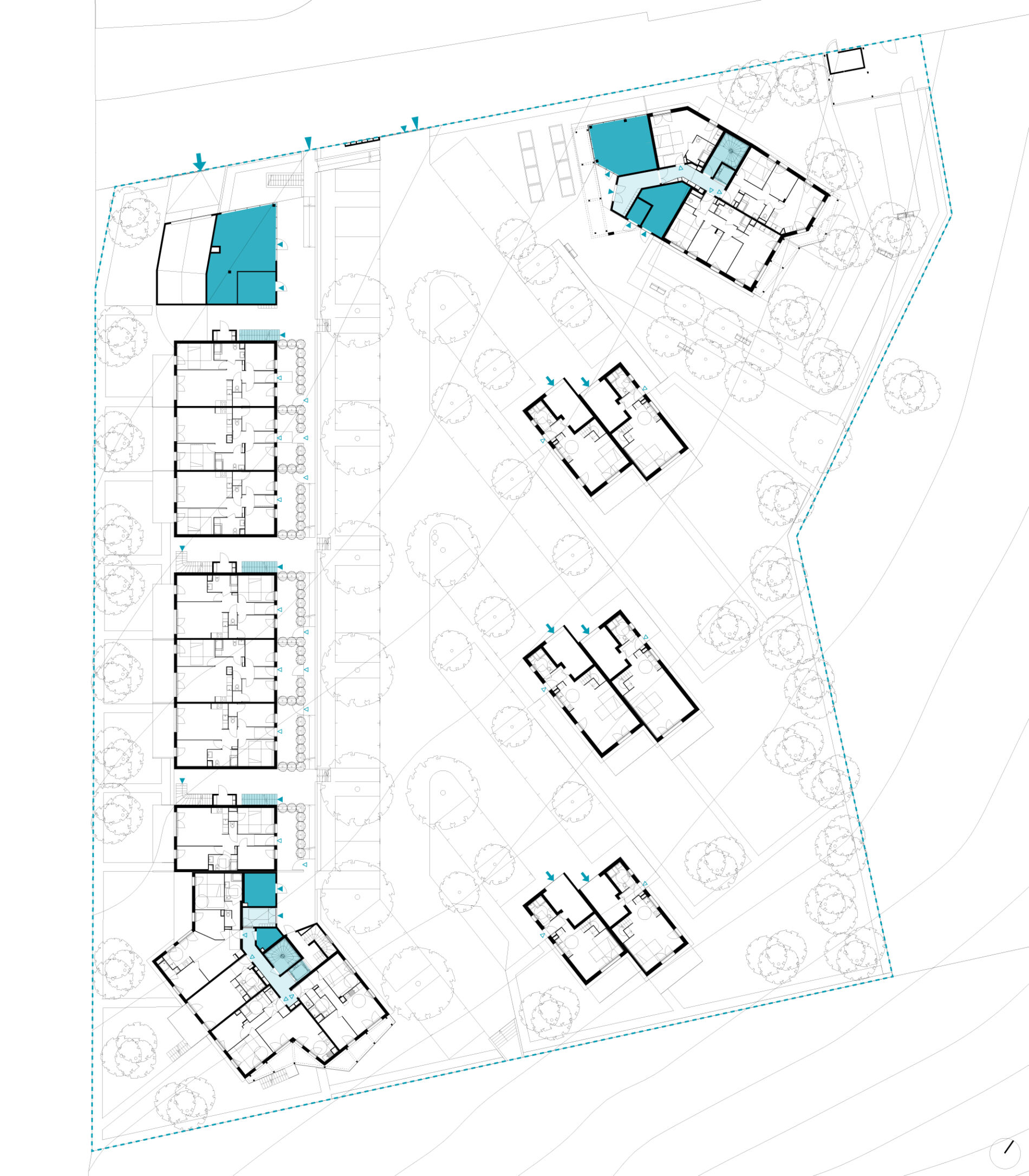Le programme mixe des typologies différentes: collectives, intermédiaires et individuelles: Les bâtiments collectifs sont placés aux angles du terrain, les logements intermédiaires le long de la voie ferrée en haut de pente et les maisons au sud, décalées. Cette répartition permet l’optimisation des vues sans vis-à-vis.