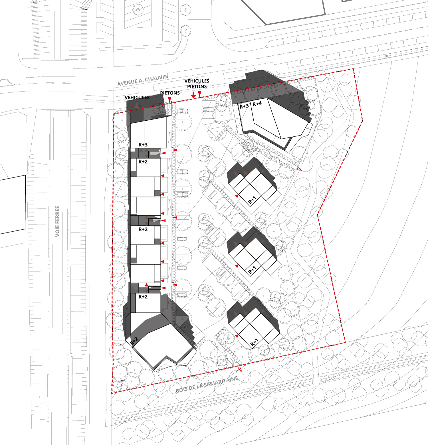 Les pré-existants:- La voie SNCF du RER A au nord- Une pente pente vers le sud- Un nouveau front urbain à l'est- Un bois à l'ouest