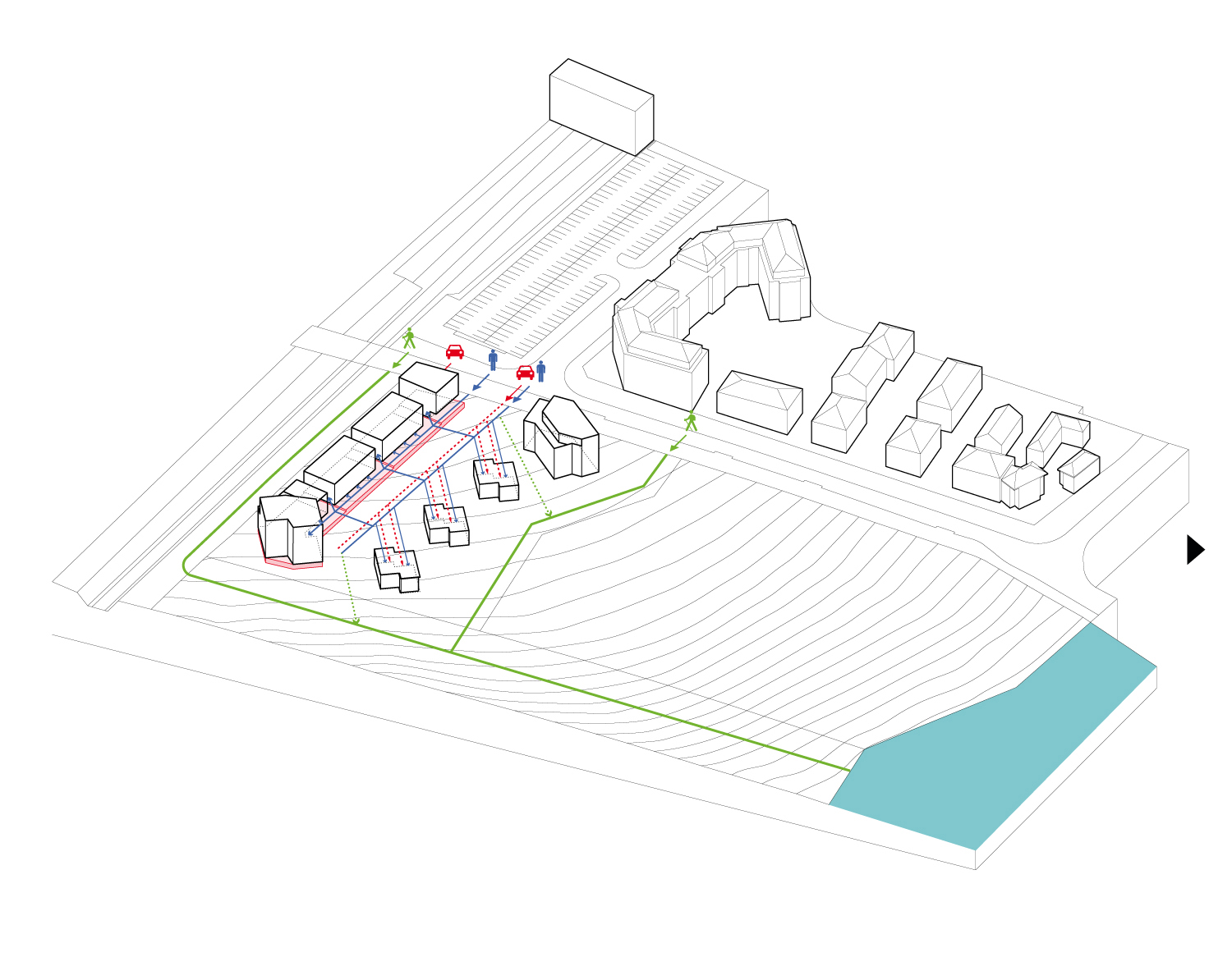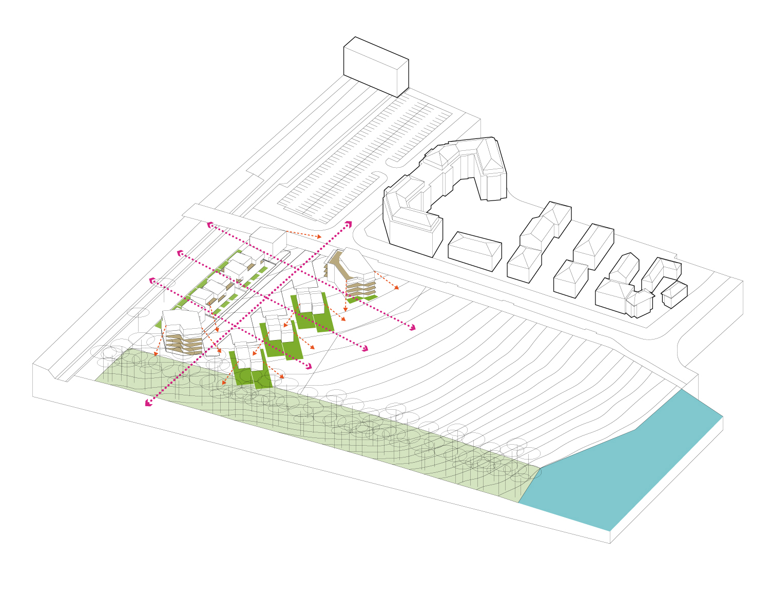 Le second axe permet de multiplier les vues depuis la rue et l’intérieur de l’îlot vers le bois, diminuant les vis-à-vis entre les bâtiments des deux lots. Les maisons et les collectifs suivent cette direction et s’ouvrent vers le bois.