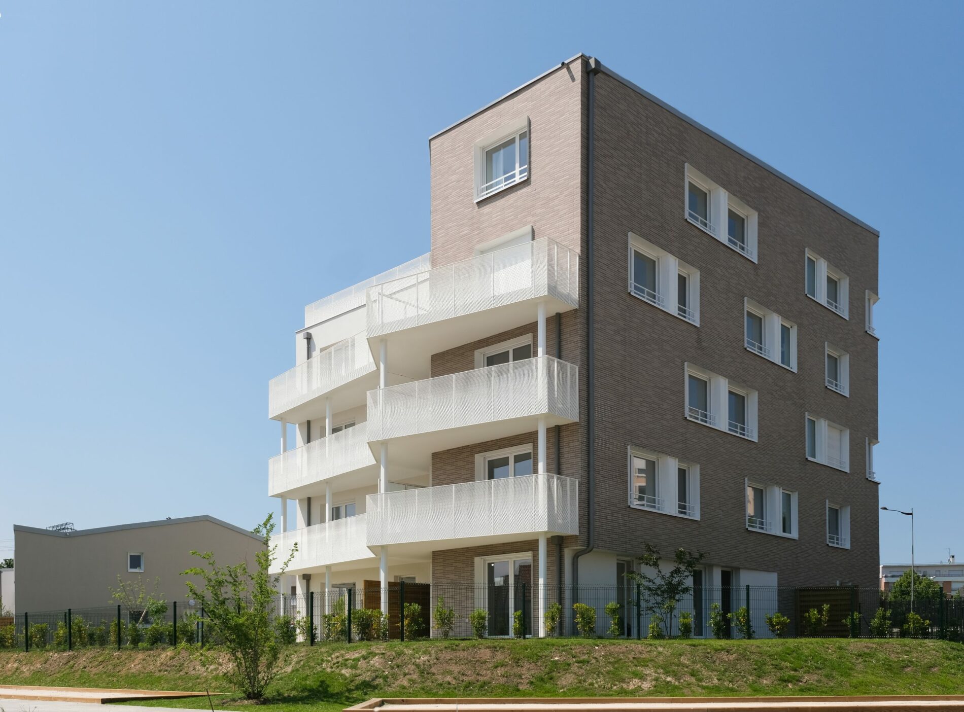 les balcons filants des logements du bâtiment collectif, s’ouvrant vers le bois de la Samaritaine