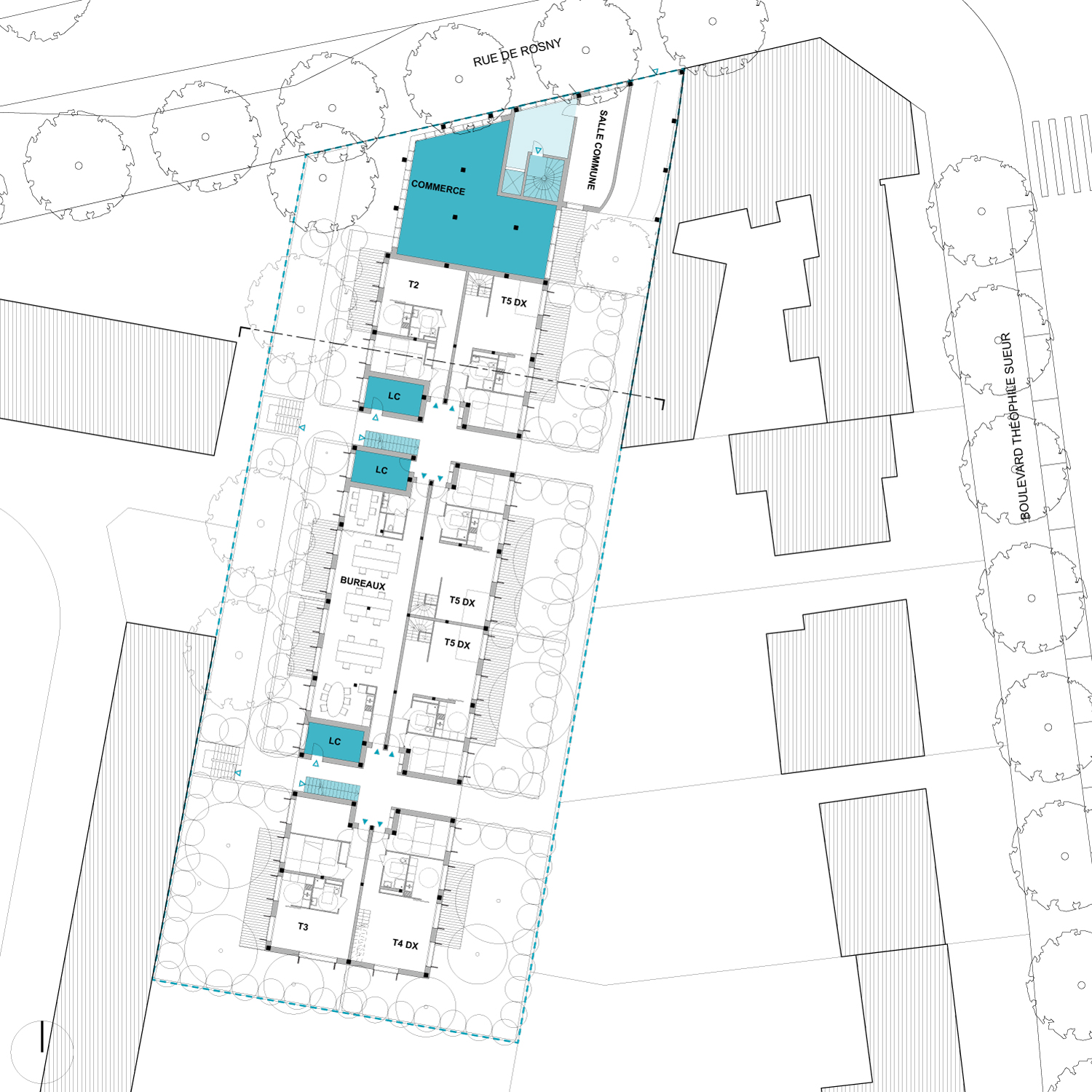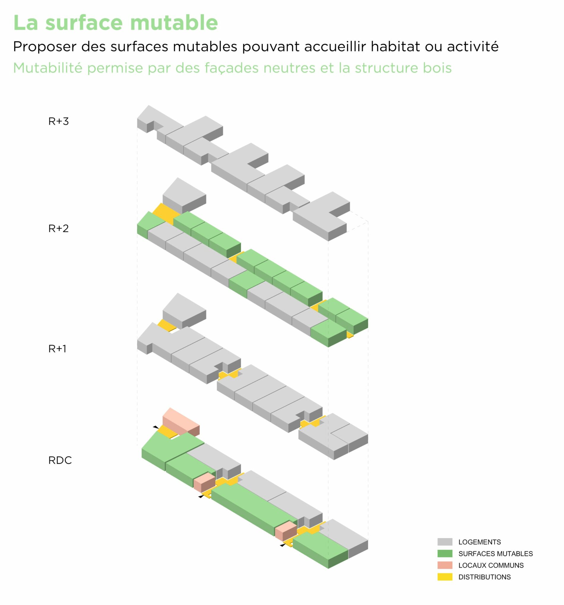 > Mixité programmatique proposée par des surfaces « non affectées » aisément partitionnables au RDC pouvant accueillir commerce, espace de quartier, activités artisanale ou tertiaire, etc.