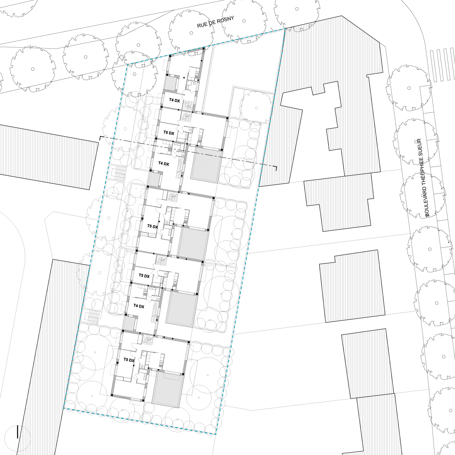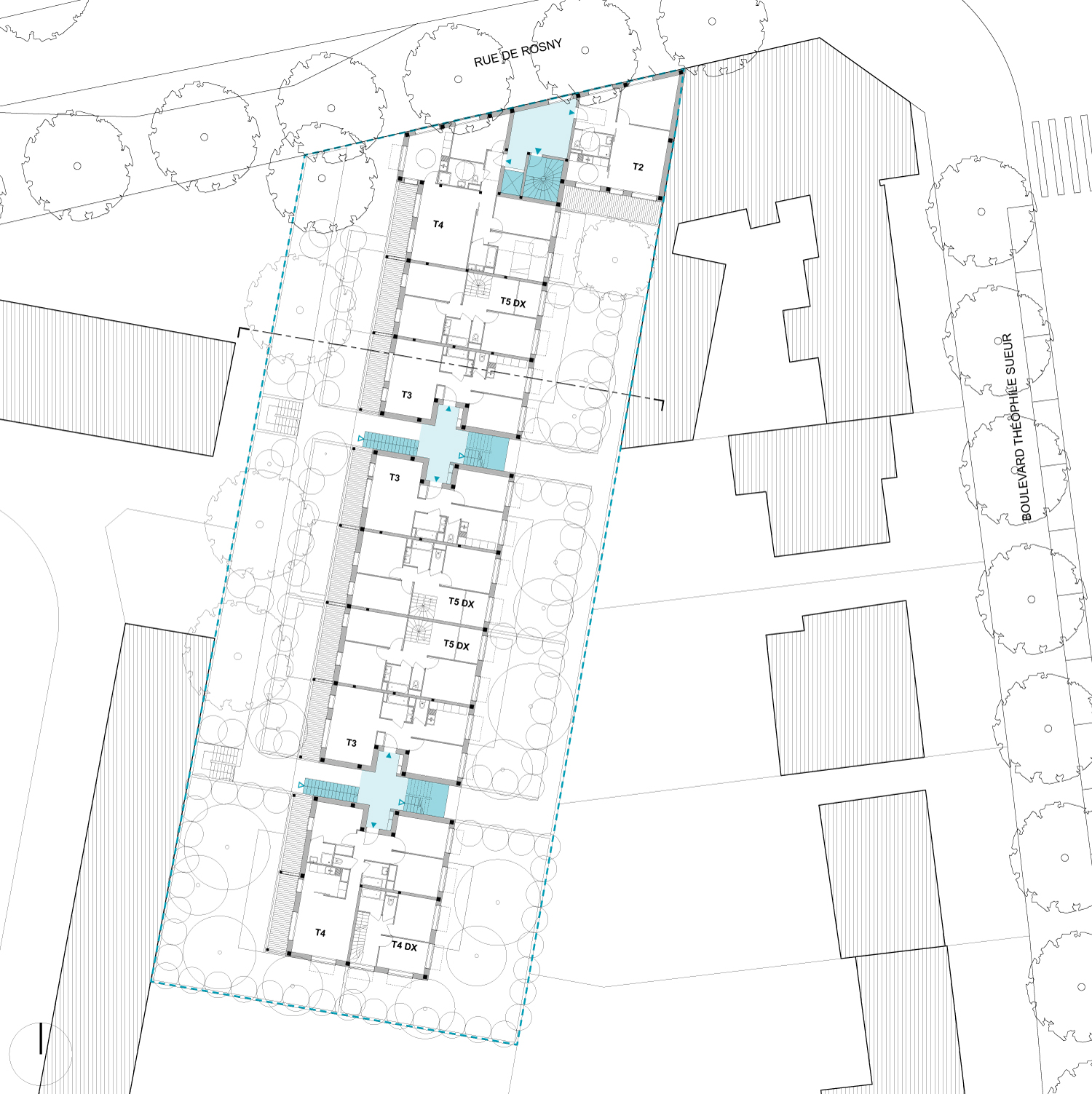 Caractérisé par le parcellaire agricole sur lequel il s’inscrit, le site de projet est une profonde lanière située dans le haut Montreuil. Implanté perpendiculairement à la rue, orienté Est-Ouest, d’échelle continue mais morcelée, le projet est le reflet de l’hétérogénéité des typologies périurbaines alentour.