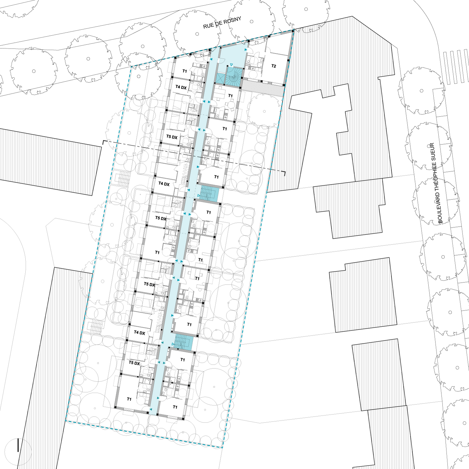 Un cheminement intérieur longitudinal éclairé naturellement permet de distribuer face çà face les studios et grands logements.
