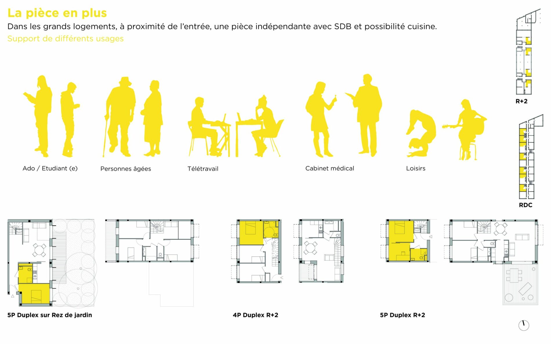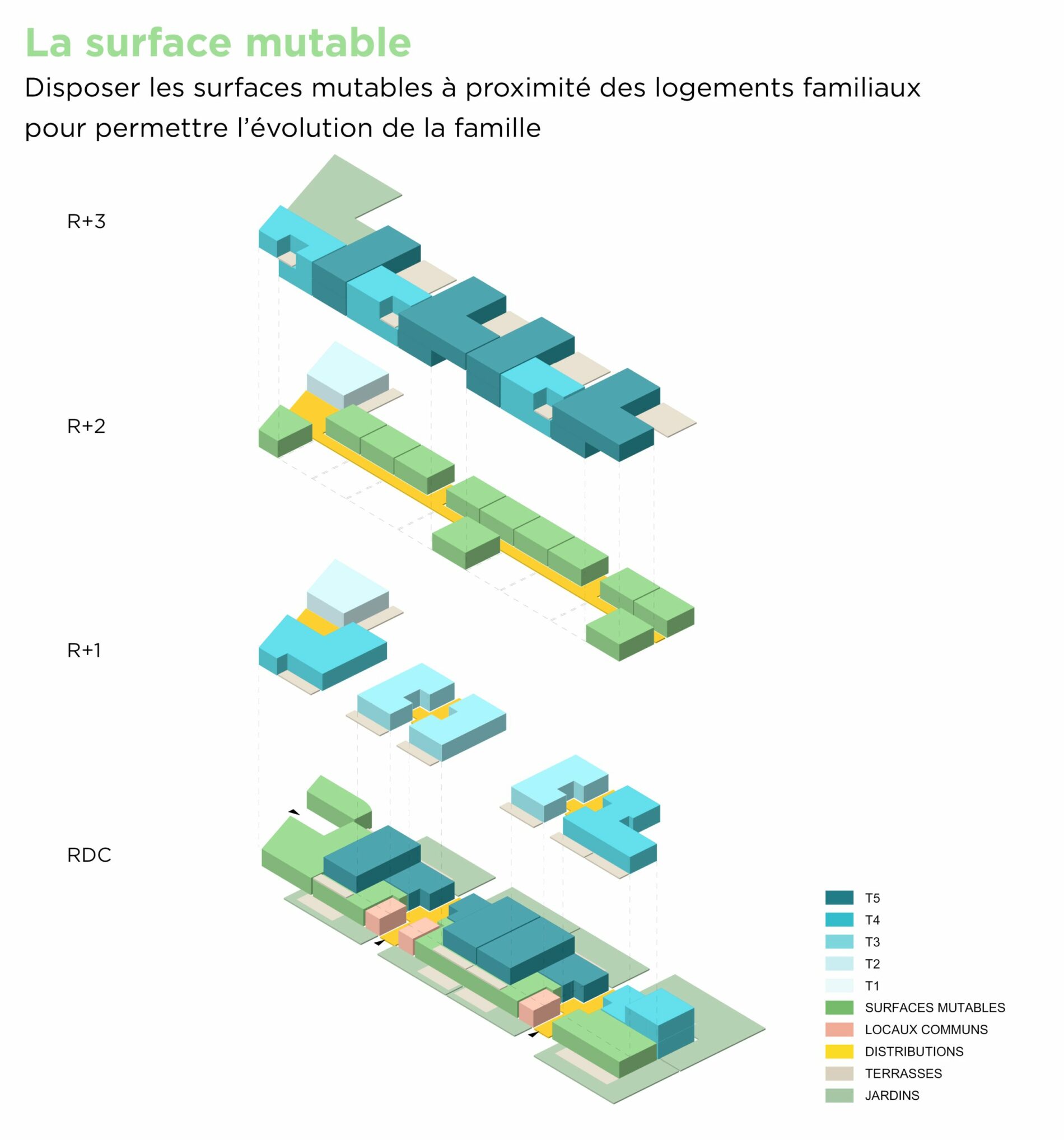 > Évolutivité des situations familiales par la disposition de studios de 25m2, proches de grands logements familiaux sur le principe de la chambre de bonne.